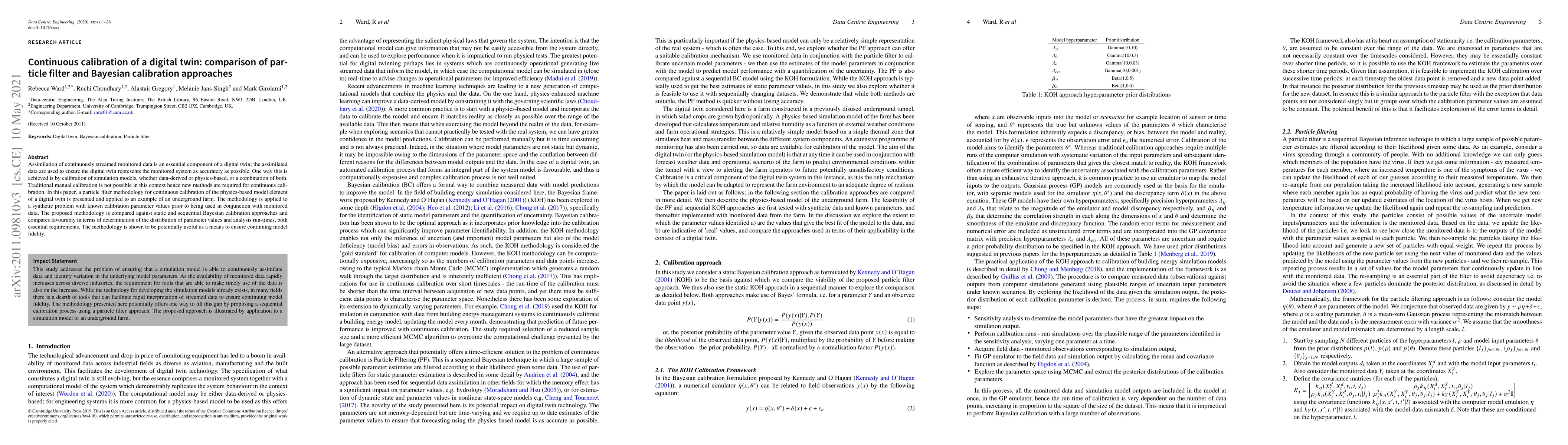 This paper presents a particle filter methodology for continuous calibration of a digital twin's physics-based model, comparing it favorably against static and sequential Bayesian calibration approaches. The particle filter method shows superior performance in determining parameter distributions and reducing analysis run-times.