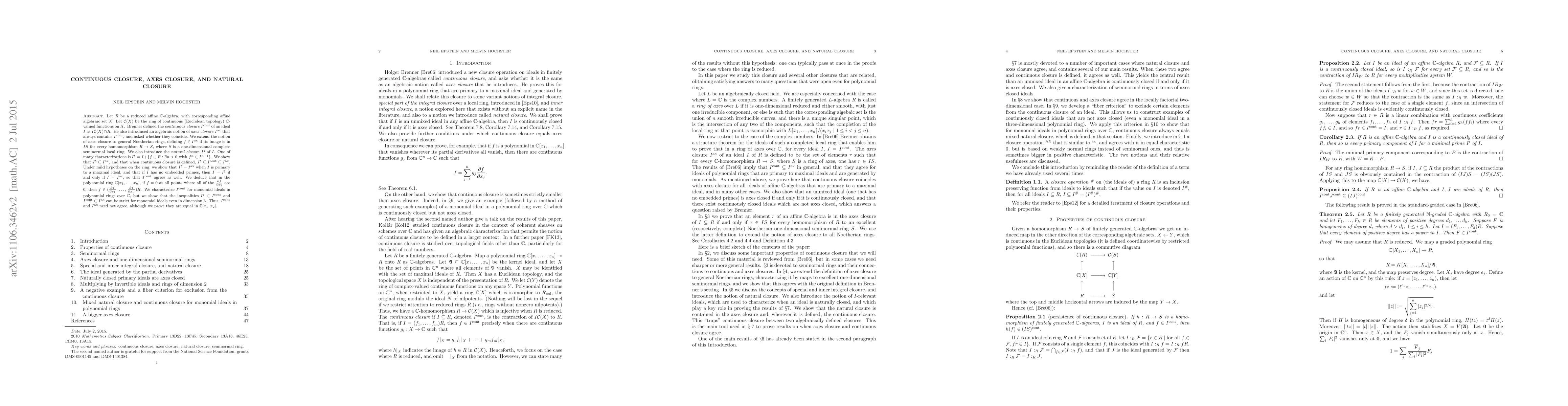 Let $R$ be a reduced affine $\mathbb C$-algebra, with corresponding affine algebraic set $X$. Let $\mathcal C(X)$ be the ring of continuous (Euclidean topology) $\mathbb C$-valued functions on $X$. Brenner defined the \emph{continuous closure} $I^{\rm cont}$ of an ideal $I$ as $I\mathcal C(X) \cap R$. He also introduced an algebraic notion of \emph{axes closure} $I^{\rm ax}$ that always contains $I^{\rm cont}$, and asked whether they coincide. We extend the notion of axes closure to general Noetherian rings, defining $f \in I^{\rm ax}$ if its image is in $IS$ for every homomorphism $R \to S$, where $S$ is a one-dimensional complete seminormal local ring. We also introduce the \emph{natural closure} $I^\natural$ of $I$. One of many characterizations is $I^\natural = I + \{f \in R: \exists n >0 \text{ with } f^n \in I^{n+1}\}$. We show that $I^\natural \subseteq I^{\rm ax}$, and that when continuous closure is defined, $I^\natural \subseteq I^{\rm cont }\subseteq I^{\rm ax}$. Under mild hypotheses on the ring, we show that $I^\natural= I^{\rm ax}$ when $I$ is primary to a maximal ideal, and that if $I$ has no embedded primes, then $I = I^\natural$ if and only if $I = I^{\rm ax}$, so that $I^{\rm cont}$ agrees as well. We deduce that in the polynomial ring $\mathbb C[x_1, \ldots, x_n]$, if $f = 0$ at all points where all of the ${\partial f \over \partial x_i}$ are 0, then $f \in ( {\partial f \over \partial x_1}, \, \ldots, \, {\partial f \over \partial x_n})R$. We characterize $I^{\rm cont}$ for monomial ideals in polynomial rings over $\mathbb C$, but we show that the inequalities $I^\natural \subset I^{\rm cont}$ and $I^{\rm cont} \subset I^{\rm ax}$ can be strict for monomial ideals even in dimension 3. Thus, $I^{\rm cont}$ and $I^{\rm ax}$ need not agree, although we prove they are equal in $\mathbb C[x_1, x_2]$.