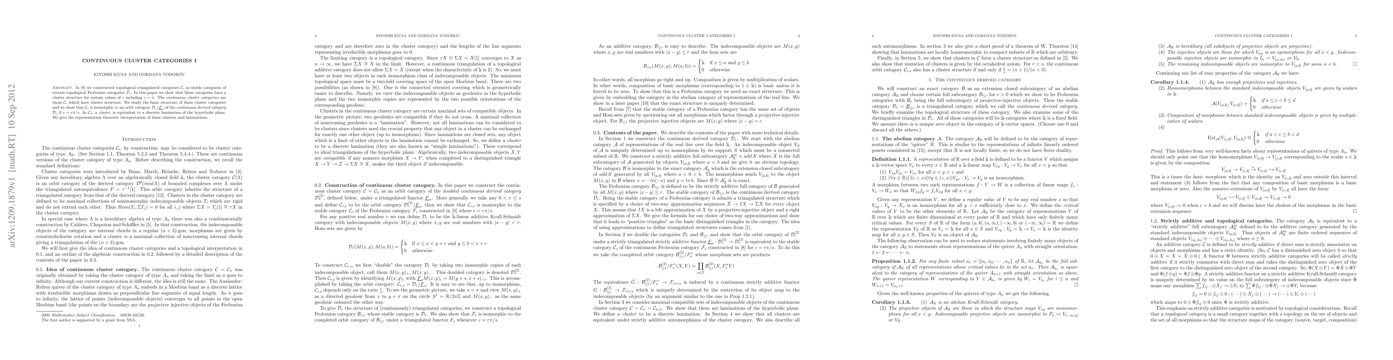 In arXiv:1209.0038 we constructed topological triangulated categories C_c as stable categories of certain topological Frobenius categories F_c. In this paper we show that these categories have a cluster structure for certain values of c including c=pi. The continuous cluster categories are those C_c which have cluster structure. We study the basic structure of these cluster categories and we show that C_c is isomorphic to an orbit category D_r/F_s of the continuous derived category D_r if c=r pi/s. In C_pi, a cluster is equivalent to a discrete lamination of the hyperbolic plane. We give the representation theoretic interpretation of these clusters and laminations.