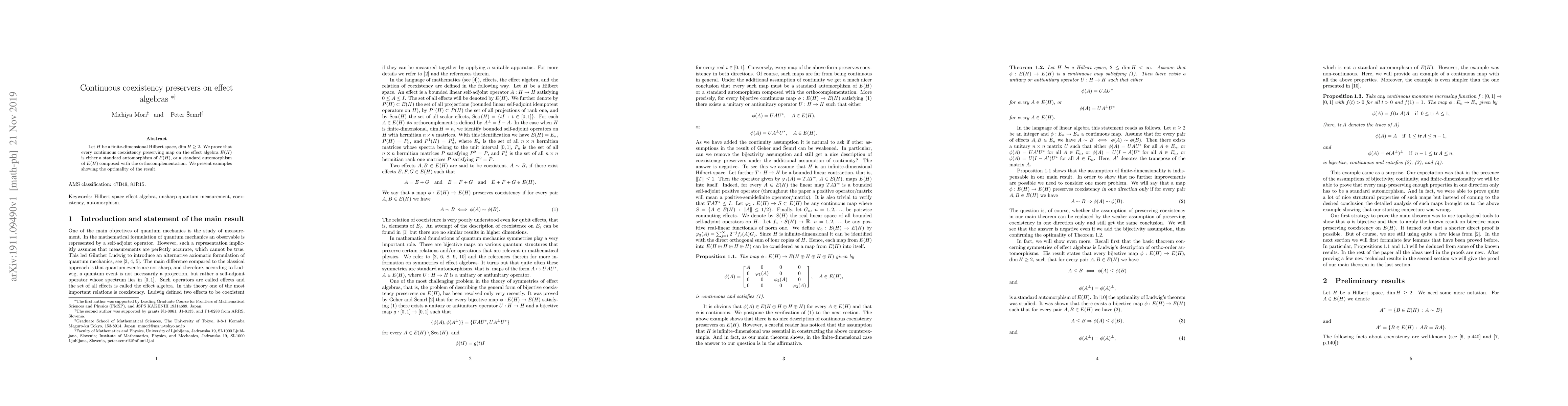 Let $H$ be a finite-dimensional Hilbert space, $\dim H \ge 2$. We prove that every continuous coexistency preserving map on the effect algebra $E(H)$ is either a standard automorphism of $E(H)$, or a standard automorphism of $E(H)$ composed with the orthocomplementation. We present examples showing the optimality of the result.
