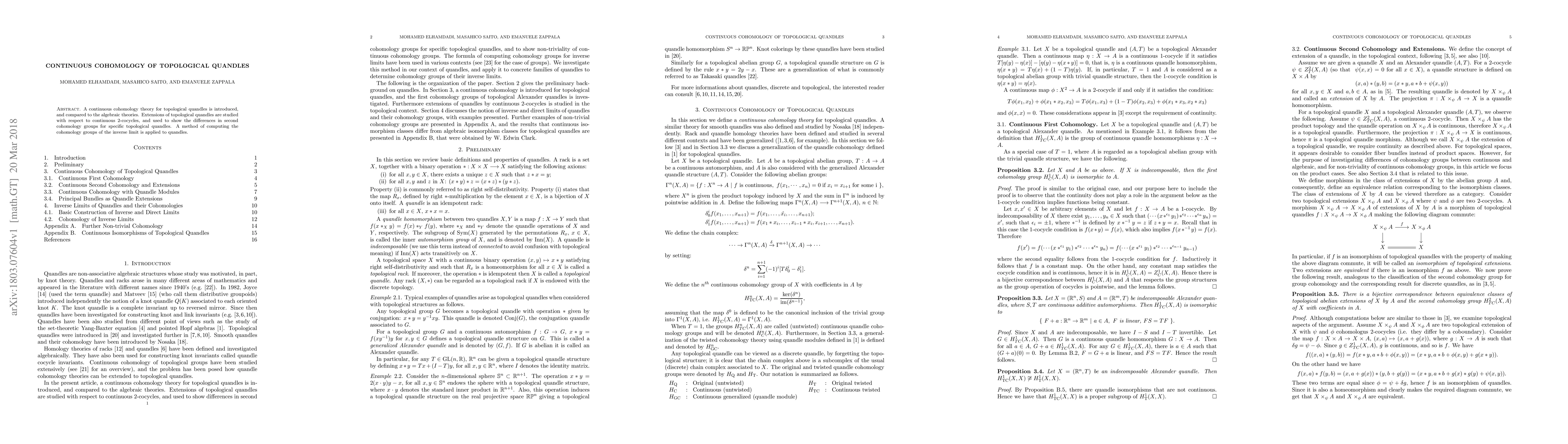Summary: This paper introduces a continuous cohomology theory for topological quandles and compares it with algebraic counterparts, exploring how continuous 2-cocycles extend these quandles and demonstrating differences in their second cohomology groups, along with a novel method for computing the cohomology of inverse limits for quandles.