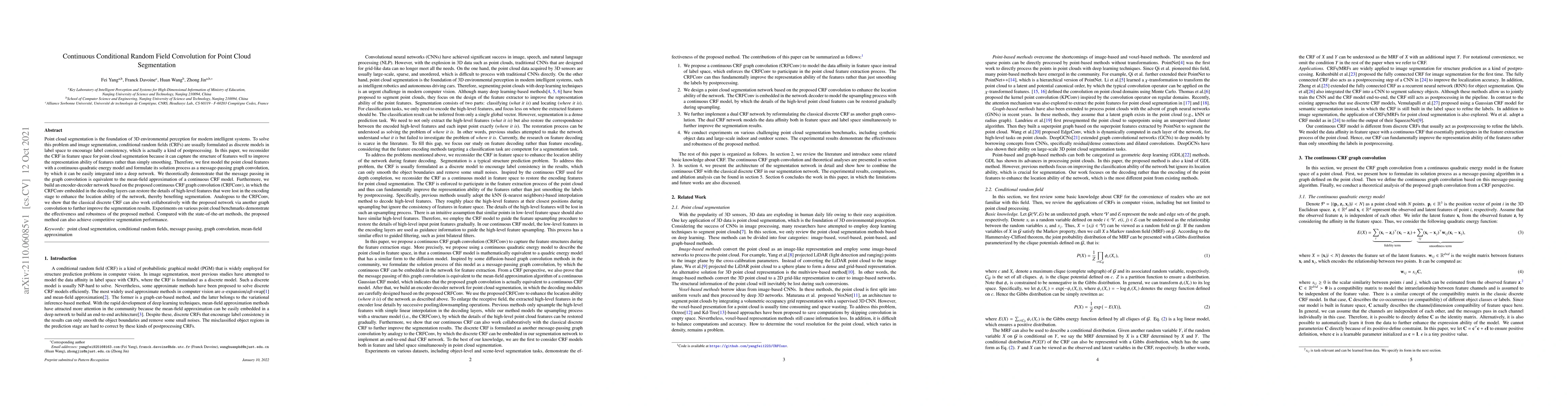 The paper proposes a continuous Conditional Random Field Convolution (CRFConv) for point cloud segmentation, formulated as a message-passing graph convolution. It demonstrates the equivalence of message passing to the mean-field approximation of a continuous CRF model and integrates it into an encoder-decoder network.
