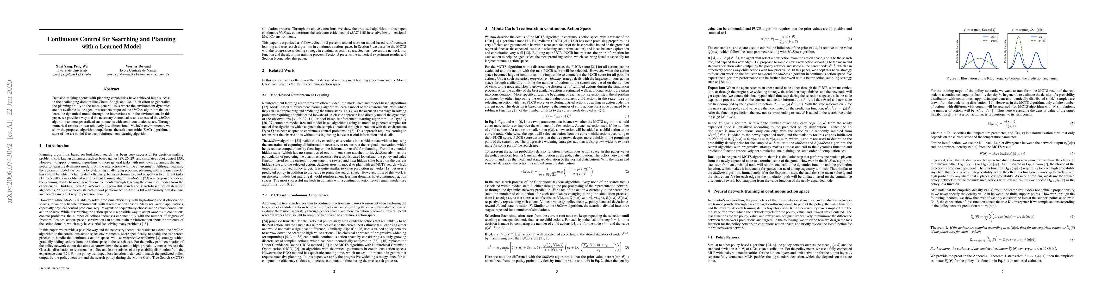 This paper extends the MuZero algorithm to handle continuous action spaces, providing a theoretical foundation and demonstrating its effectiveness through numerical results in low-dimensional MuJoCo environments, where it outperforms the state-of-the-art model-free reinforcement learning algorithm, soft actor-critic (SAC).