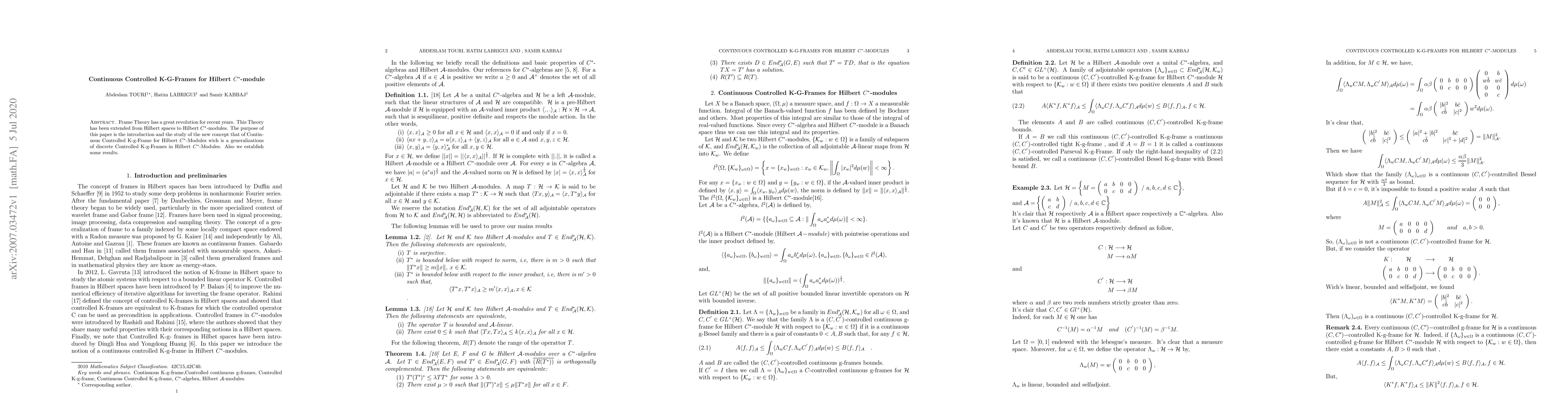 This paper introduces Continuous Controlled K-g-Frames for Hilbert $C^\ast$-modules, generalizing discrete Controlled K-g-Frames, and establishes several theoretical results. The study extends frame theory from Hilbert spaces to Hilbert $C^\ast$-modules.