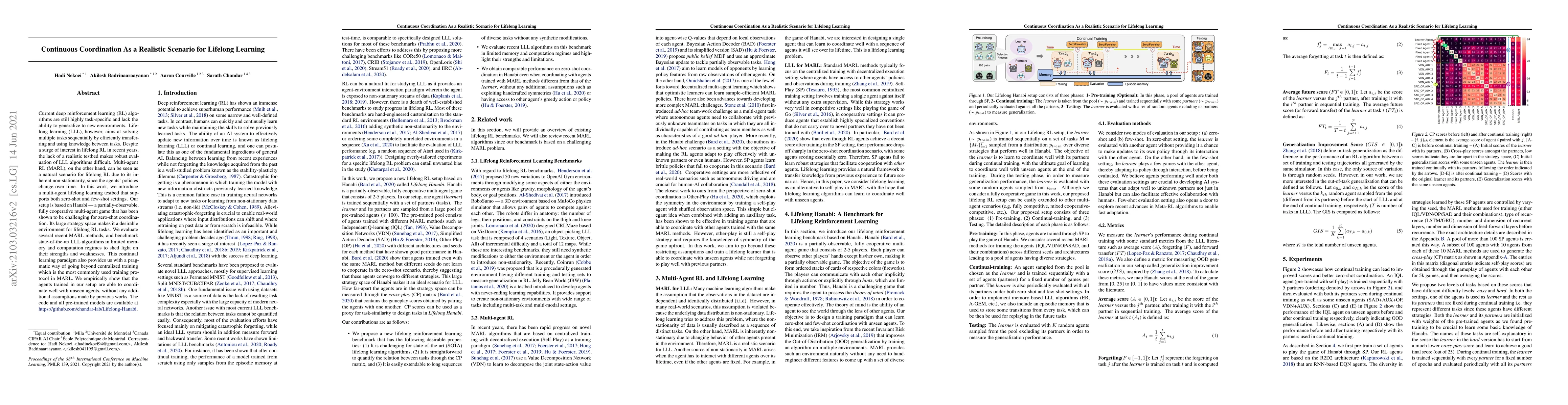 Current deep reinforcement learning (RL) algorithms are still highly task-specific and lack the ability to generalize to new environments. Lifelong learning (LLL), however, aims at solving multiple tasks sequentially by efficiently transferring and using knowledge between tasks. Despite a surge of interest in lifelong RL in recent years, the lack of a realistic testbed makes robust evaluation of LLL algorithms difficult. Multi-agent RL (MARL), on the other hand, can be seen as a natural scenario for lifelong RL due to its inherent non-stationarity, since the agents' policies change over time. In this work, we introduce a multi-agent lifelong learning testbed that supports both zero-shot and few-shot settings. Our setup is based on Hanabi -- a partially-observable, fully cooperative multi-agent game that has been shown to be challenging for zero-shot coordination. Its large strategy space makes it a desirable environment for lifelong RL tasks. We evaluate several recent MARL methods, and benchmark state-of-the-art LLL algorithms in limited memory and computation regimes to shed light on their strengths and weaknesses. This continual learning paradigm also provides us with a pragmatic way of going beyond centralized training which is the most commonly used training protocol in MARL. We empirically show that the agents trained in our setup are able to coordinate well with unseen agents, without any additional assumptions made by previous works. The code and all pre-trained models are available at https://github.com/chandar-lab/Lifelong-Hanabi.