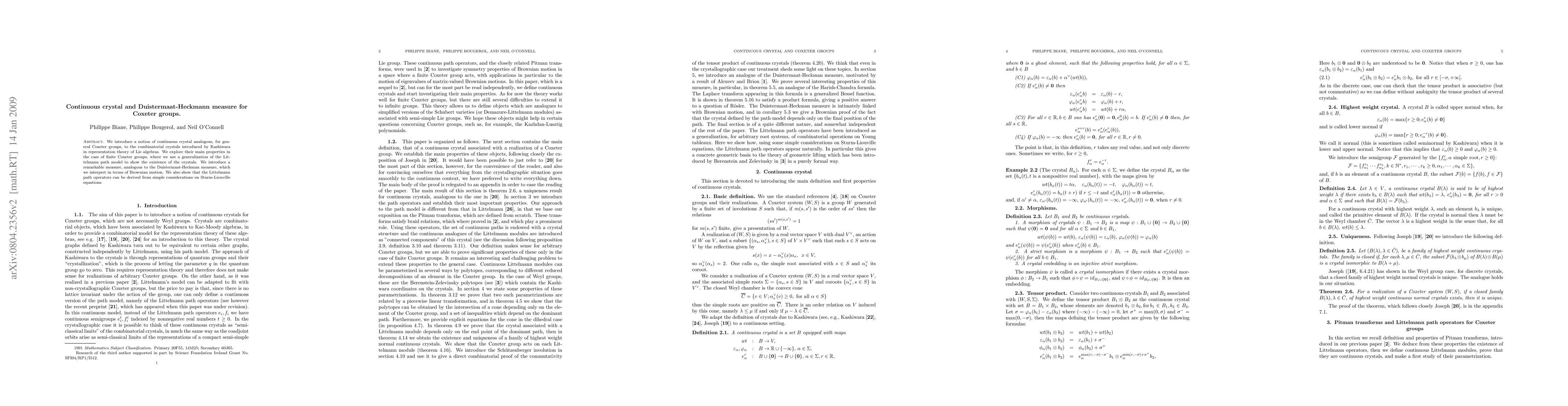 This paper introduces continuous crystals for Coxeter groups, analogous to Kashiwara's combinatorial crystals, and uses a generalized Littelmann path model to establish their existence. It also explores an associated Duistermaat-Heckman measure interpreted via Brownian motion and derives Littelmann path operators from Sturm-Liouville equations.