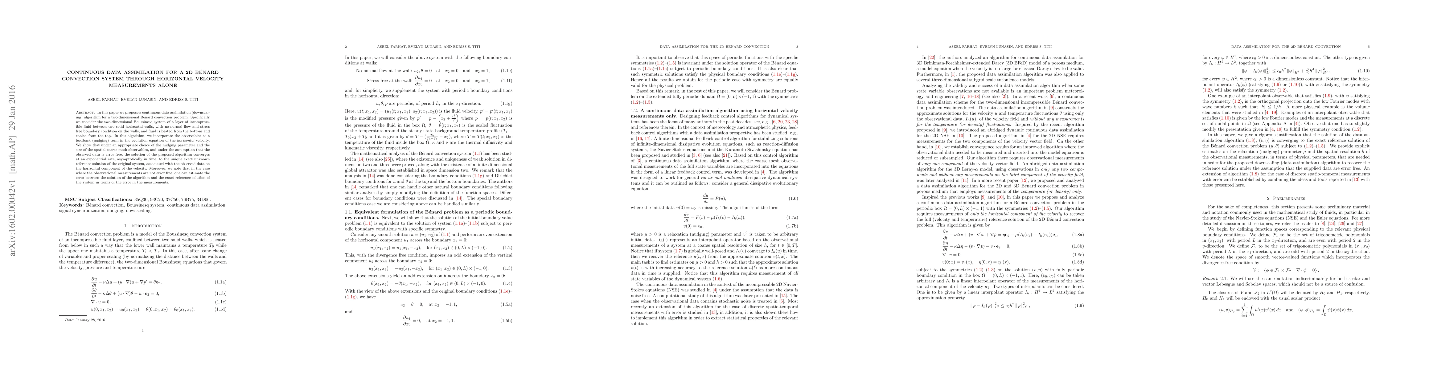 This paper proposes a continuous data assimilation algorithm for a 2D Bénard convection system, incorporating horizontal velocity measurements as a feedback term. The algorithm converges exponentially to the exact solution when measurements are error-free, and estimates error when measurements contain inaccuracies.