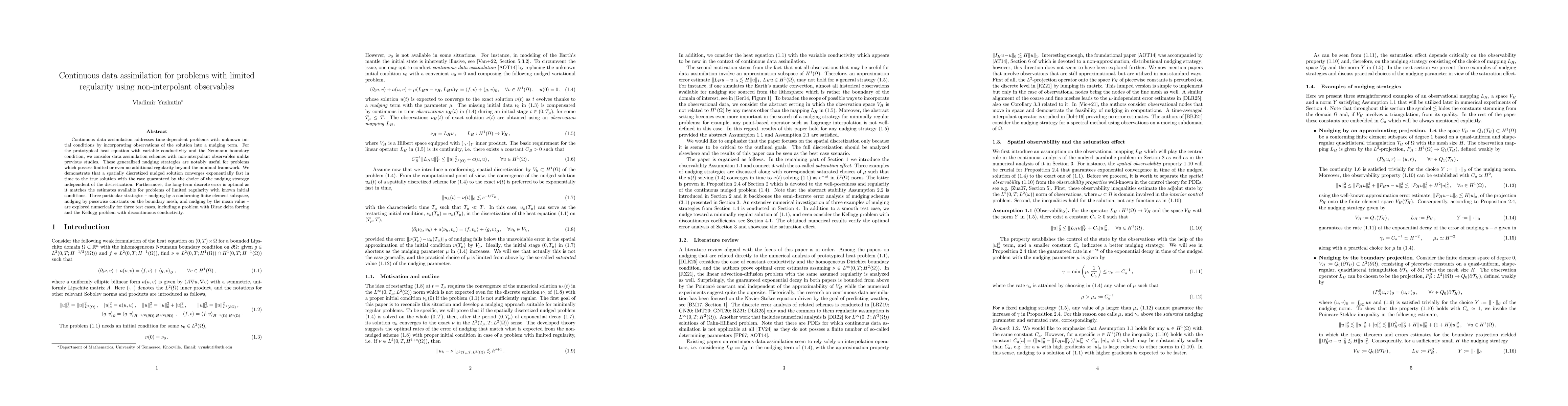 The paper presents an abstract nudging scheme (3.1) with theoretical guarantees for exponential decay and optimal long-term discretization errors for problems with limited regularity, supported by numerical experiments.