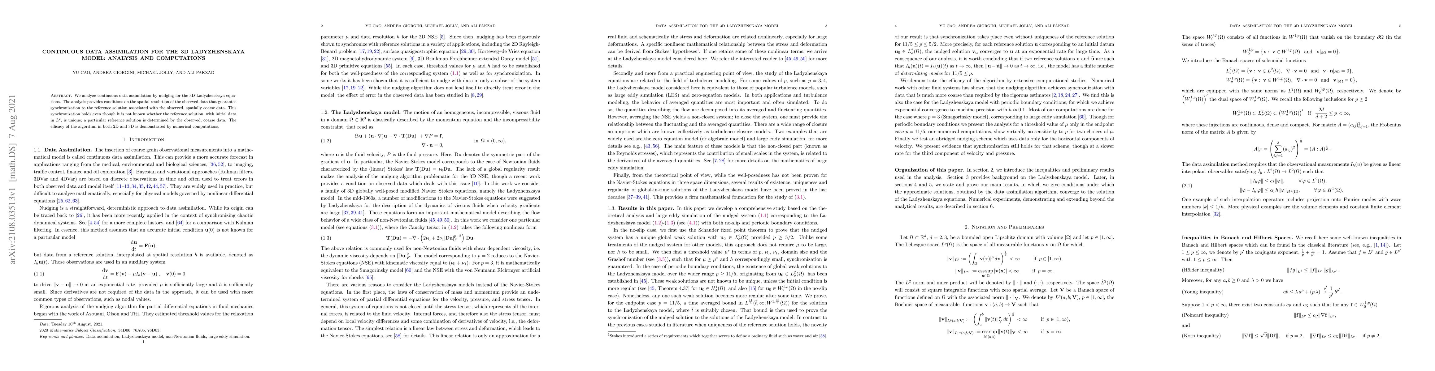We analyze continuous data assimilation by nudging for the 3D Ladyzhenskaya equations. The analysis provides conditions on the spatial resolution of the observed data that guarantee synchronization to the reference solution associated with the observed, spatially coarse data. This synchronization holds even though it is not known whether the reference solution, with initial data in $L^2$, is unique; a particular reference solution is determined by the observed, coarse data. The efficacy of the algorithm in both 2D and 3D is demonstrated by numerical computations.