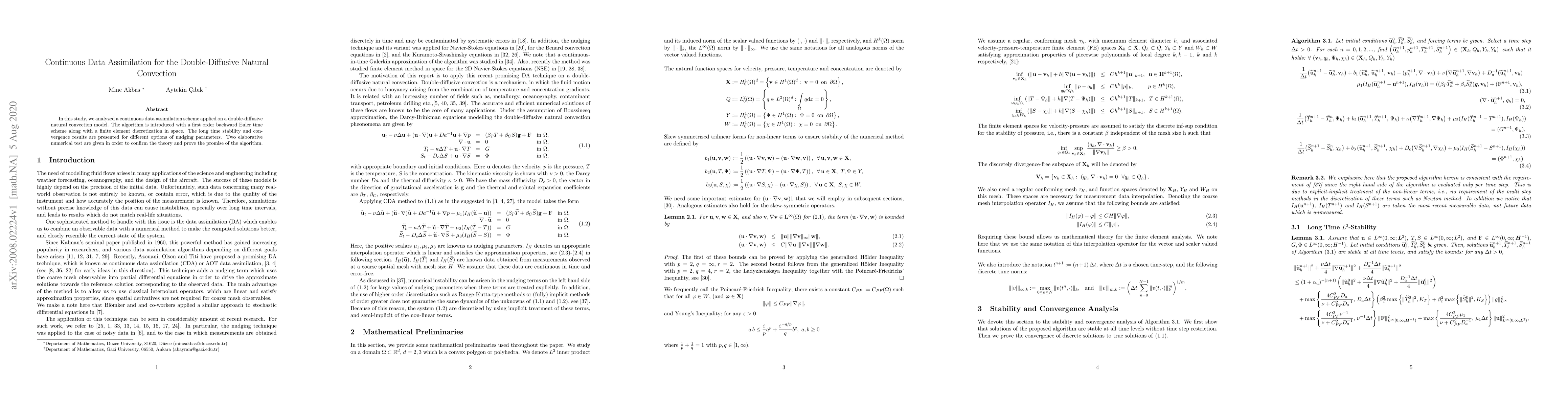 This paper investigates a continuous data assimilation scheme for a double-diffusive natural convection model, employing a first-order backward Euler time scheme and finite element spatial discretization. The study presents stability and convergence results for various nudging parameters and validates the algorithm through two detailed numerical tests.