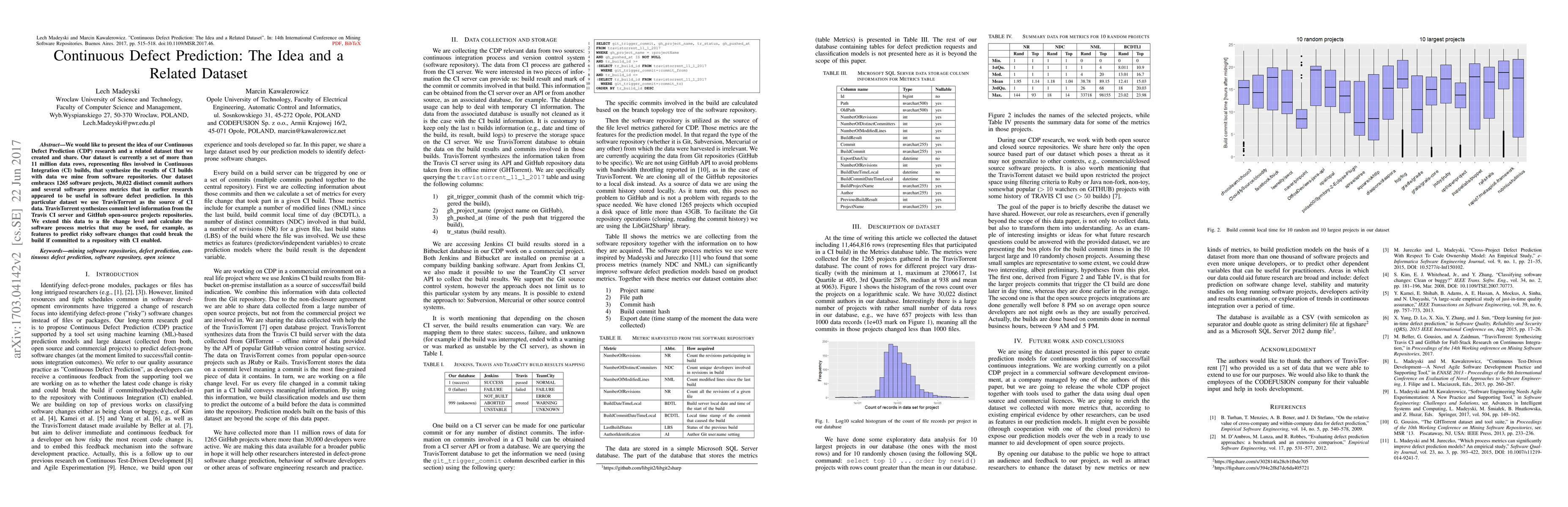 This paper introduces Continuous Defect Prediction (CDP) research and presents a dataset of over 11 million rows from Continuous Integration builds, encompassing 1265 projects, 30,000 authors, and various software metrics. The dataset aims to predict risky software changes that may break CI builds.