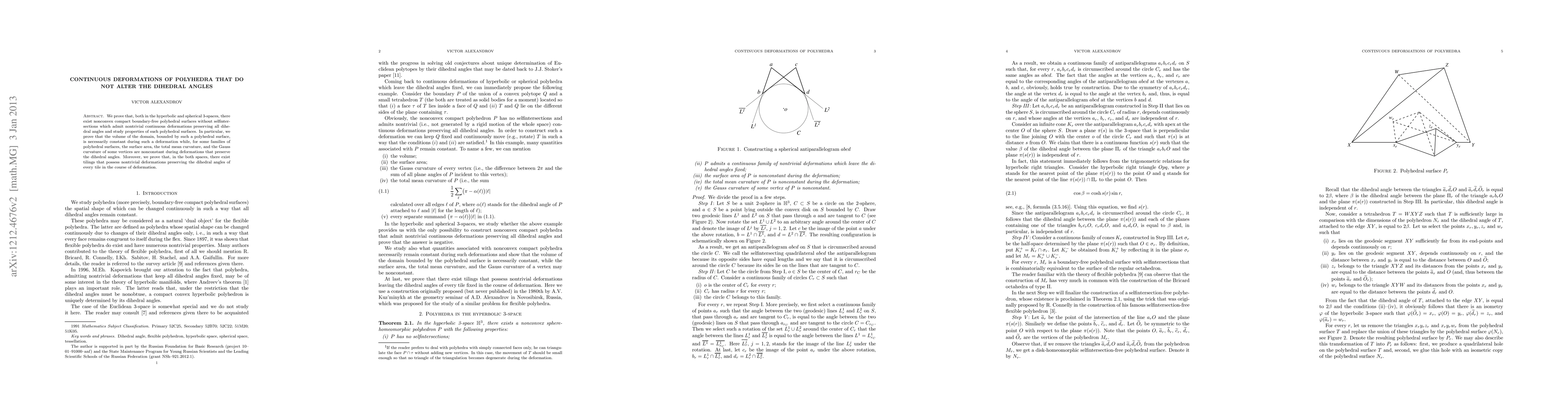 We prove that, both in the hyperbolic and spherical 3-spaces, there exist nonconvex compact boundary-free polyhedral surfaces without selfintersections which admit nontrivial continuous deformations preserving all dihedral angles and study properties of such polyhedral surfaces. In particular, we prove that the volume of the domain, bounded by such a polyhedral surface, is necessarily constant during such a deformation while, for some families of polyhedral surfaces, the surface area, the total mean curvature, and the Gauss curvature of some vertices are nonconstant during deformations that preserve the dihedral angles. Moreover, we prove that, in the both spaces, there exist tilings that possess nontrivial deformations preserving the dihedral angles of every tile in the course of deformation.