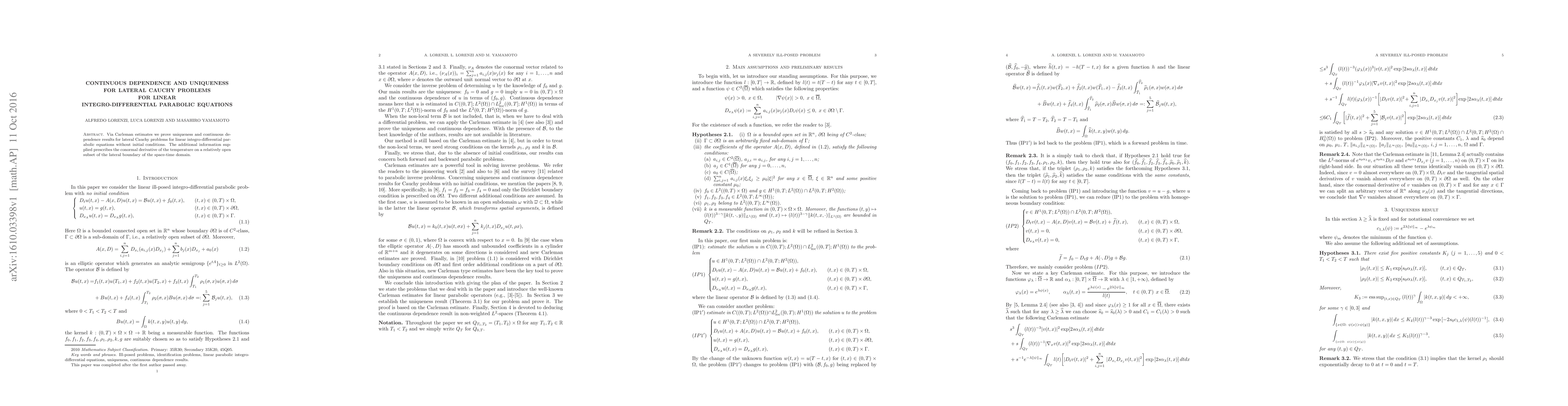 Via Carleman estimates we prove uniqueness and continuous dependence results for lateral Cauchy problems for linear integro-differential parabolic equations without initial conditions. The additional information supplied prescribes the conormal derivative of the temperature on a relatively open subset of the lateral boundary of the space-time domain.