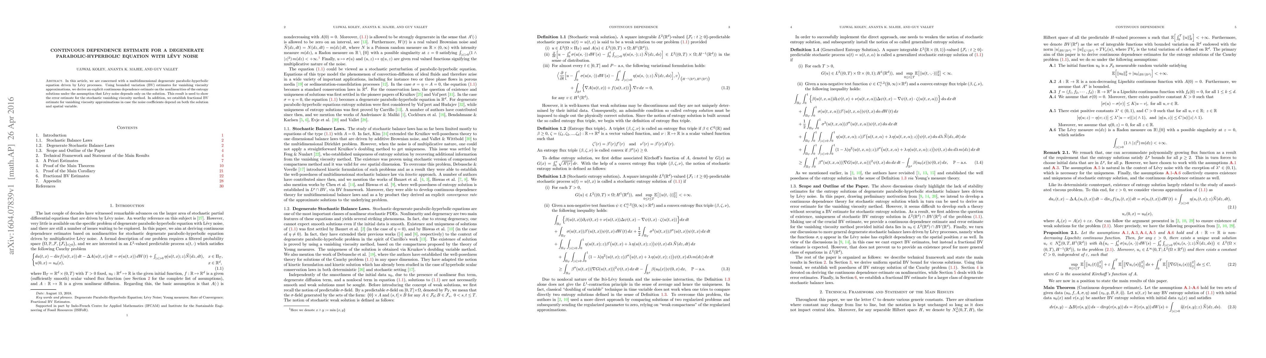 This paper derives continuous dependence estimates for entropy solutions of a degenerate parabolic-hyperbolic equation driven by Lévy noise, using BV estimates for vanishing viscosity approximations. It also establishes error estimates for the stochastic vanishing viscosity method and fractional BV estimates for cases where noise coefficients depend on both the solution and spatial variable.