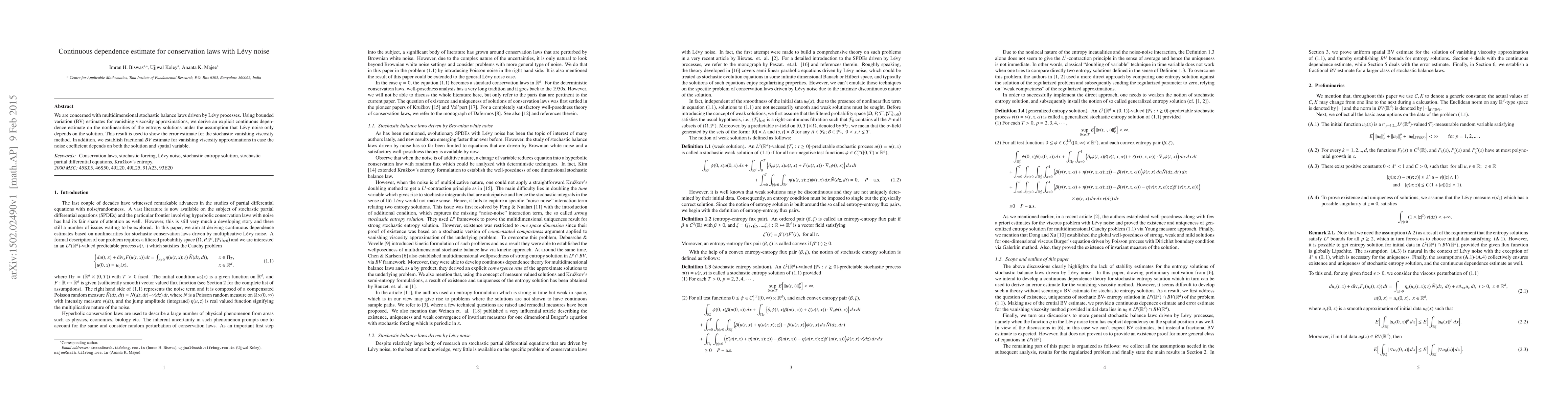 This paper derives a continuous dependence estimate for entropy solutions of multidimensional stochastic conservation laws driven by Lévy noise, using BV estimates for vanishing viscosity approximations. The study also establishes an error estimate for the stochastic vanishing viscosity method and provides a fractional $BV$ estimate when the noise coefficient is spatially dependent.