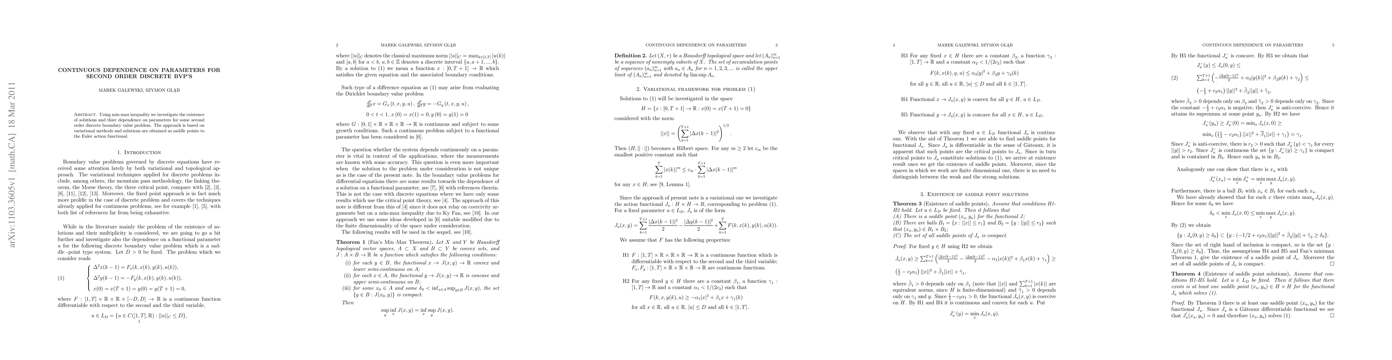 Using min-max inequality we investigate the existence of solutions and thier dependence on parameters for some second order discrete boundary value problem. The approach is based on variational methods and solutions are obtained as saddle points to the Euler action functional.