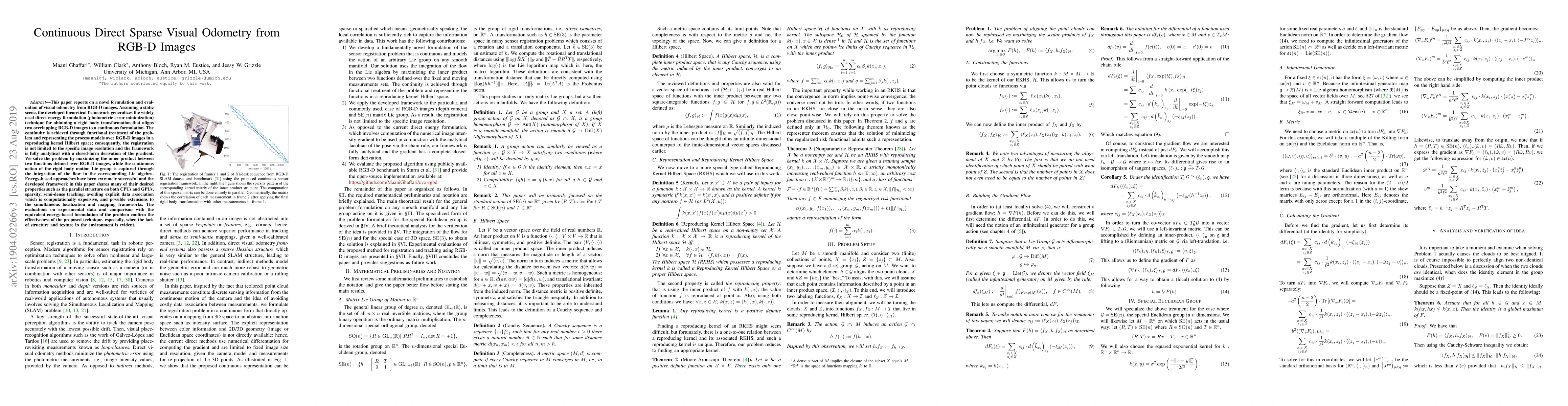 This paper reports on a novel formulation and evaluation of visual odometry from RGB-D images. Assuming a static scene, the developed theoretical framework generalizes the widely used direct energy formulation (photometric error minimization) technique for obtaining a rigid body transformation that aligns two overlapping RGB-D images to a continuous formulation. The continuity is achieved through functional treatment of the problem and representing the process models over RGB-D images in a reproducing kernel Hilbert space; consequently, the registration is not limited to the specific image resolution and the framework is fully analytical with a closed-form derivation of the gradient. We solve the problem by maximizing the inner product between two functions defined over RGB-D images, while the continuous action of the rigid body motion Lie group is captured through the integration of the flow in the corresponding Lie algebra. Energy-based approaches have been extremely successful and the developed framework in this paper shares many of their desired properties such as the parallel structure on both CPUs and GPUs, sparsity, semi-dense tracking, avoiding explicit data association which is computationally expensive, and possible extensions to the simultaneous localization and mapping frameworks. The evaluations on experimental data and comparison with the equivalent energy-based formulation of the problem confirm the effectiveness of the proposed technique, especially, when the lack of structure and texture in the environment is evident.