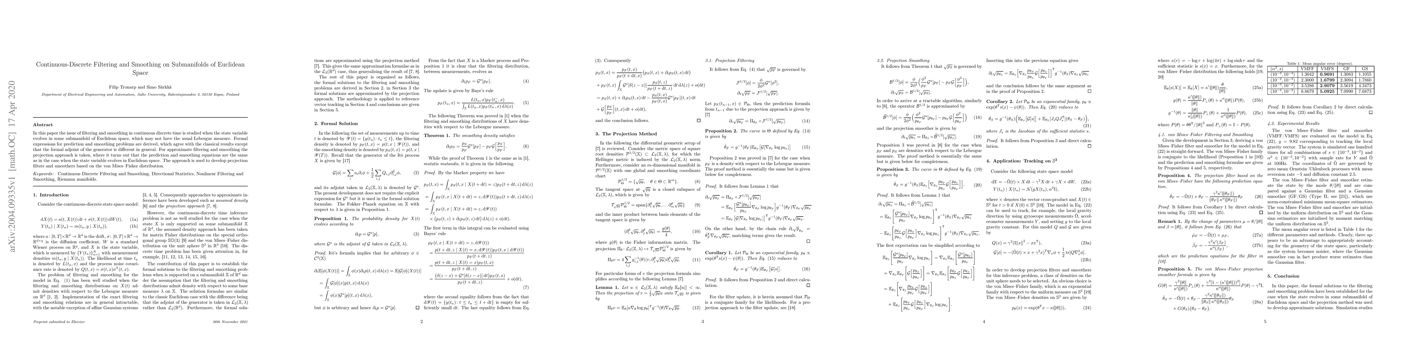 This paper develops filtering and smoothing methods for state variables evolving on submanifolds of Euclidean space, deriving formal expressions that differ from classical results due to a distinct formal adjoint. It employs projection techniques to approximate these methods, yielding prediction and smoothing equations identical to those in Euclidean space, and applies this approach to create projection filters and smoothers based on the von Mises-Fisher distribution.