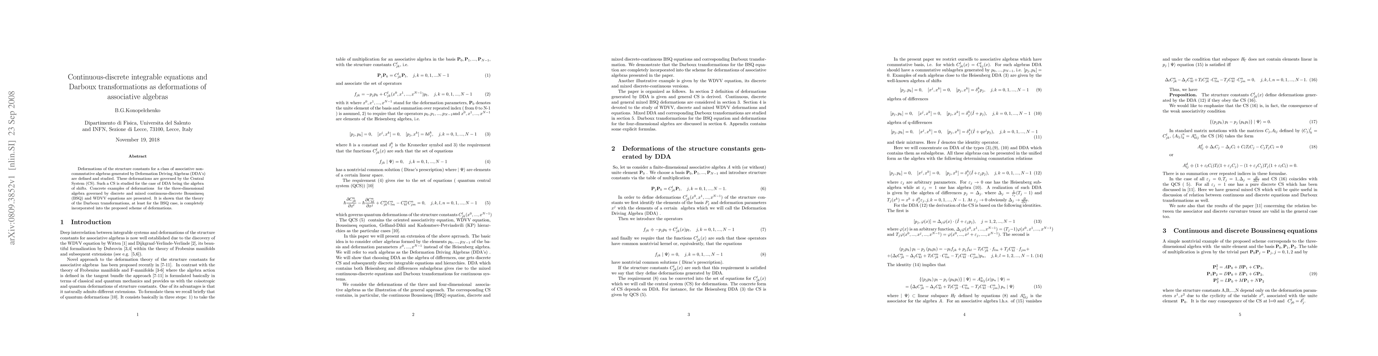 Deformations of the structure constants for a class of associative noncommutative algebras generated by Deformation Driving Algebras (DDA's) are defined and studied. These deformations are governed by the Central System (CS). Such a CS is studied for the case of DDA being the algebra of shifts. Concrete examples of deformations for the three-dimensional algebra governed by discrete and mixed continuous-discrete Boussinesq (BSQ) and WDVV equations are presented. It is shown that the theory of the Darboux transformations, at least for the BSQ case, is completely incorporated into the proposed scheme of deformations.