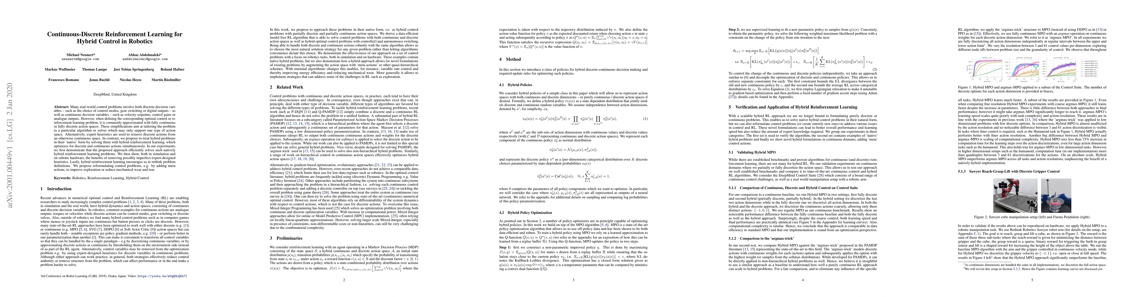This paper proposes a hybrid reinforcement learning approach to solve control problems with both discrete and continuous decision variables, demonstrating its effectiveness in simulation and on robotic hardware, and suggesting ways to reformulate problems to enhance performance and longevity.