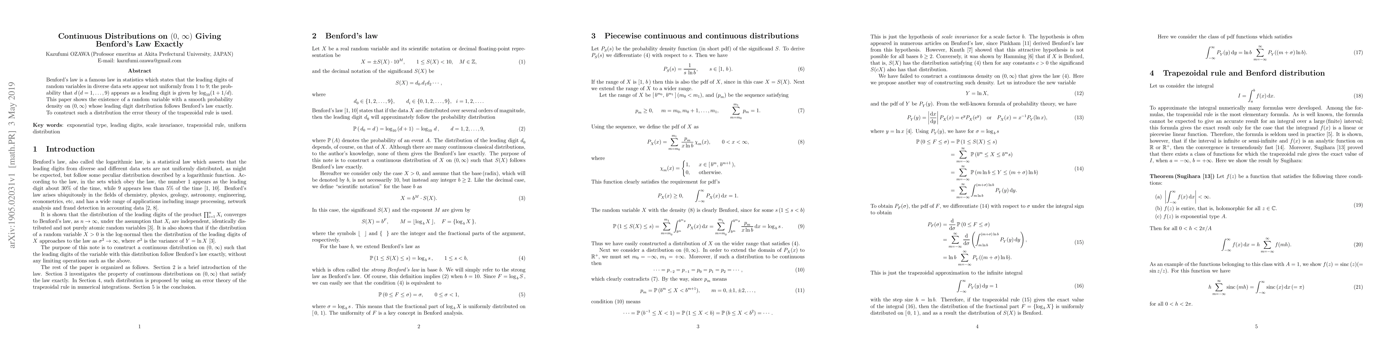 This paper demonstrates the existence of a random variable with a continuous distribution on (0,∞) that follows Benford's Law exactly, using error theory from the trapezoidal rule to construct such a distribution.