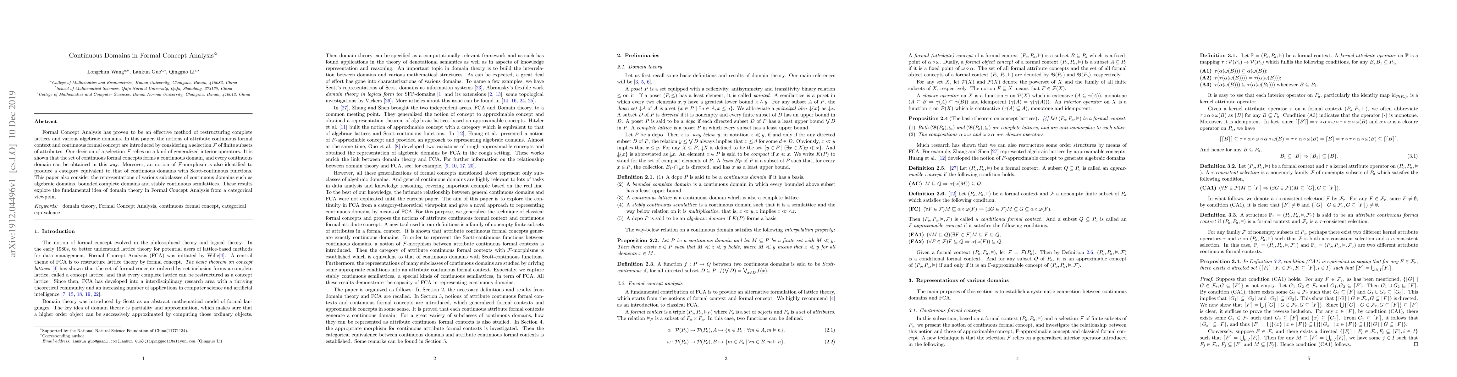 This paper introduces the concept of continuous formal concepts within Formal Concept Analysis, establishing a framework where continuous domains can be represented using generalized interior operators. It demonstrates the equivalence between continuous domains and a category of Scott-continuous functions, and explores representations of specific subclasses like algebraic and bounded complete domains.