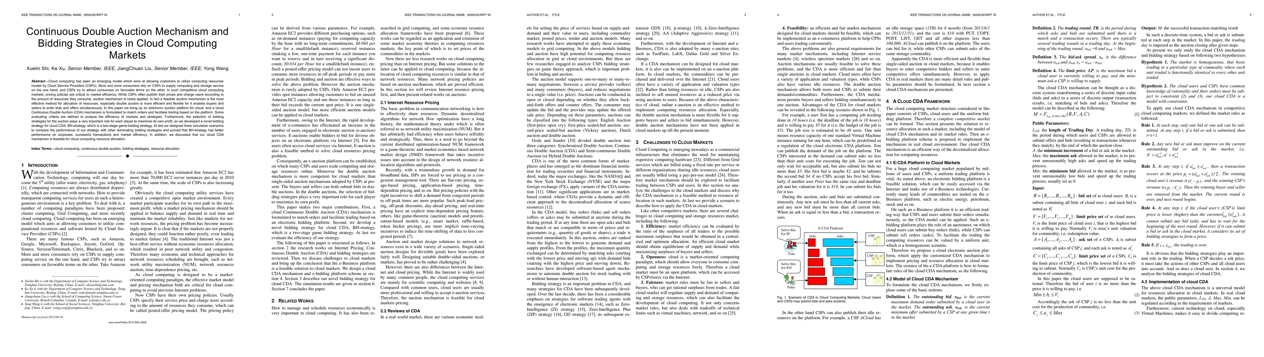 This paper proposes a Continuous Double Auction (CDA) mechanism for cloud computing markets to enhance resource allocation efficiency. It introduces a novel BH-strategy bidding approach and demonstrates its superior performance in simulations compared to other strategies, highlighting improved market efficiency and transaction success rates.