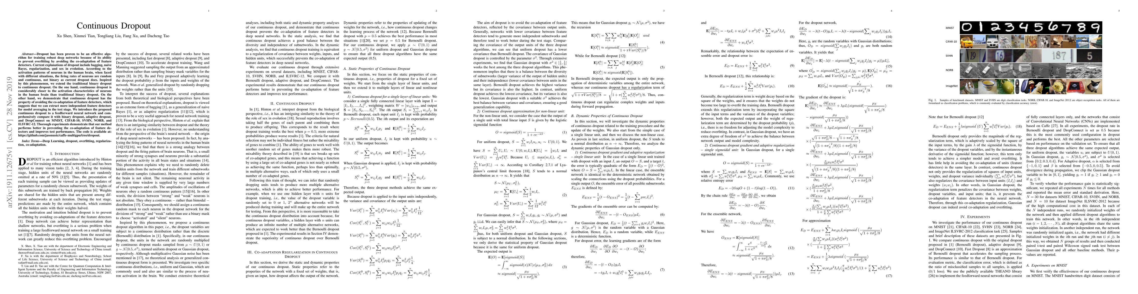 Dropout has been proven to be an effective algorithm for training robust deep networks because of its ability to prevent overfitting by avoiding the co-adaptation of feature detectors. Current explanations of dropout include bagging, naive Bayes, regularization, and sex in evolution. According to the activation patterns of neurons in the human brain, when faced with different situations, the firing rates of neurons are random and continuous, not binary as current dropout does. Inspired by this phenomenon, we extend the traditional binary dropout to continuous dropout. On the one hand, continuous dropout is considerably closer to the activation characteristics of neurons in the human brain than traditional binary dropout. On the other hand, we demonstrate that continuous dropout has the property of avoiding the co-adaptation of feature detectors, which suggests that we can extract more independent feature detectors for model averaging in the test stage. We introduce the proposed continuous dropout to a feedforward neural network and comprehensively compare it with binary dropout, adaptive dropout, and DropConnect on MNIST, CIFAR-10, SVHN, NORB, and ILSVRC-12. Thorough experiments demonstrate that our method performs better in preventing the co-adaptation of feature detectors and improves test performance. The code is available at: https://github.com/jasonustc/caffe-multigpu/tree/dropout.