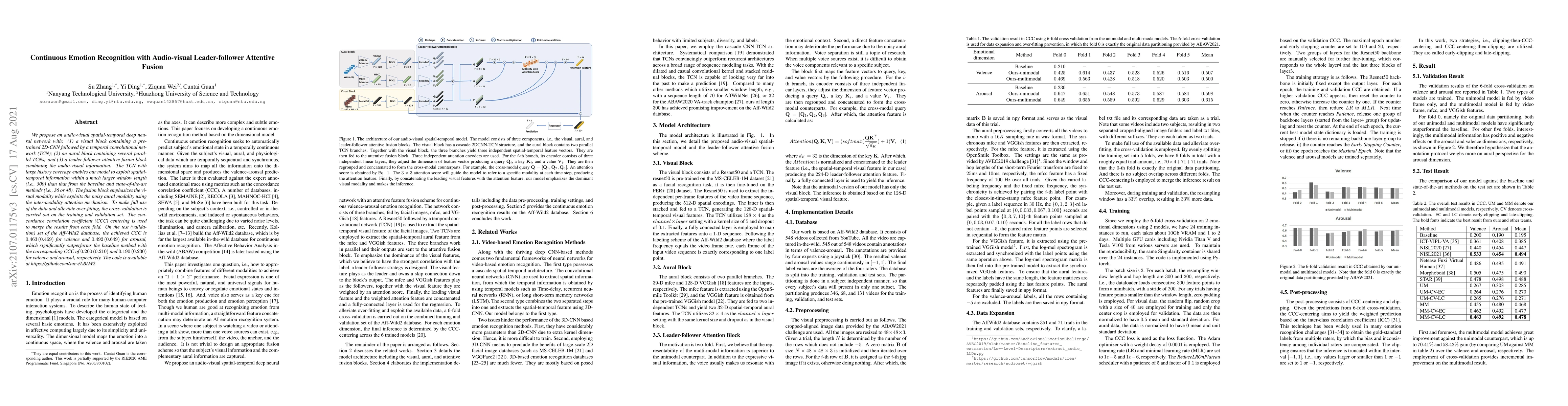 This paper proposes an audio-visual deep neural network for continuous emotion recognition using leader-follower attentive fusion. The model combines pretrained 2D-CNN and TCN for visual processing and parallel TCNs for audio, achieving superior performance on the Aff-Wild2 database with a significant improvement in CCC scores for valence and arousal.