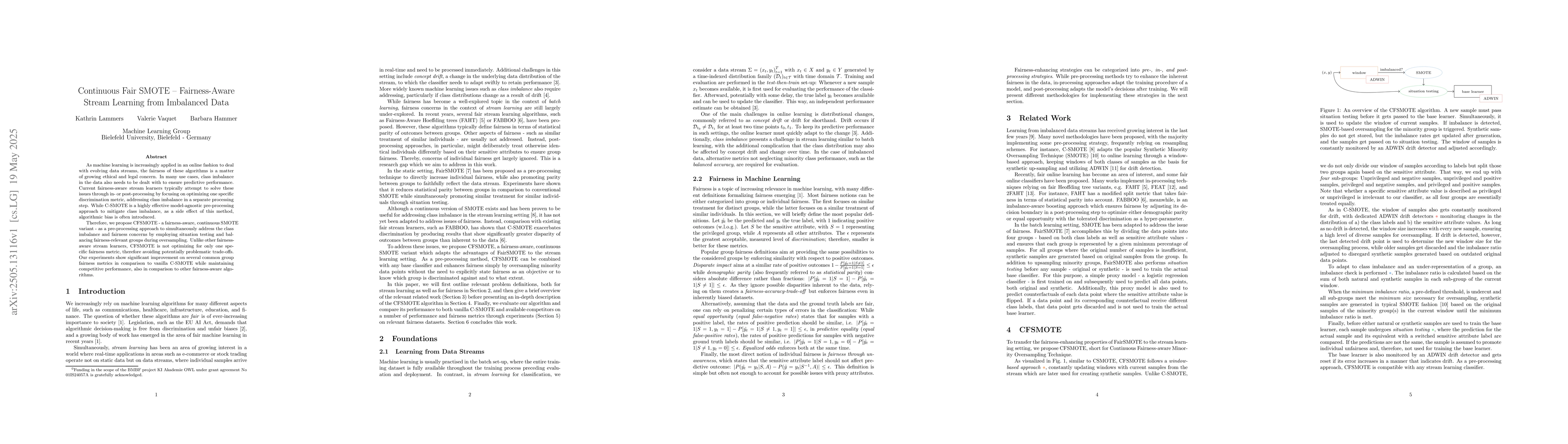 Unlike existing fairness-aware stream learners that optimize for a single fairness metric, CFSMOTE avoids problematic trade-offs by employing situation testing and balancing fairness-relevant groups.