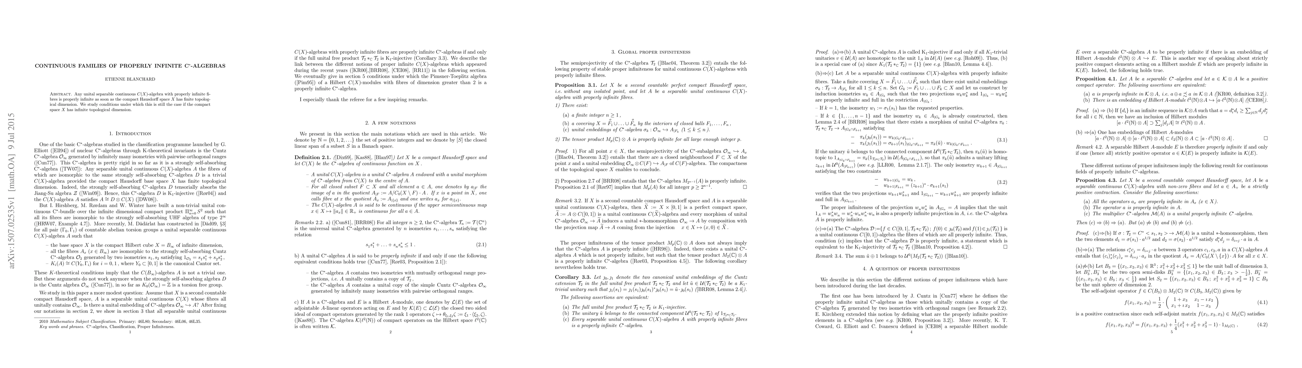 This paper explores the properties of continuous families of properly infinite C*-algebras, demonstrating that such families remain properly infinite when the compact Hausdorff space has finite topological dimension. It further investigates the conditions under which this property holds for spaces with infinite topological dimension.