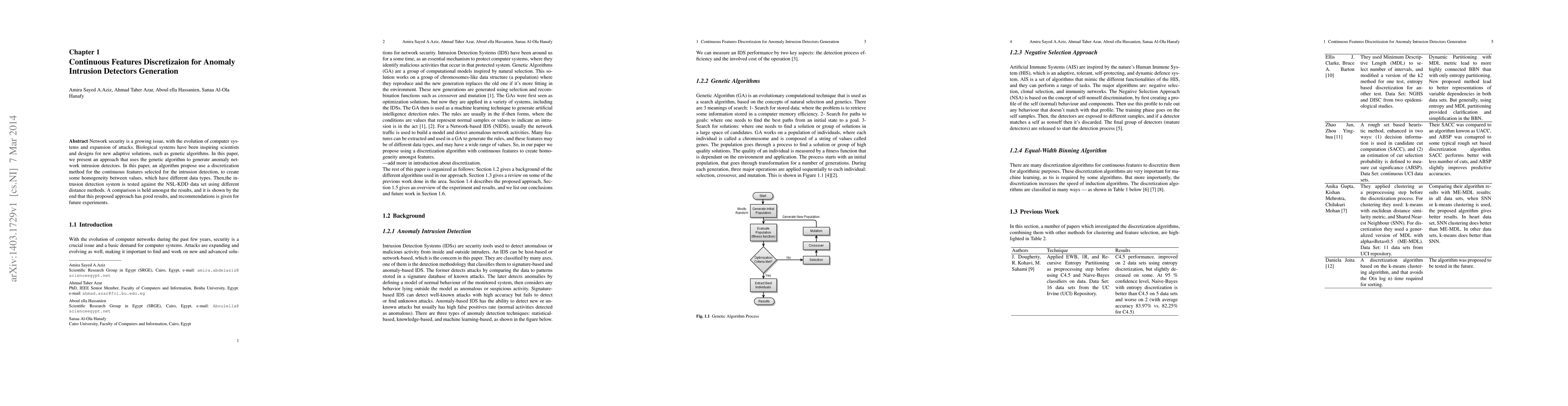 Network security is a growing issue, with the evolution of computer systems and expansion of attacks. Biological systems have been inspiring scientists and designs for new adaptive solutions, such as genetic algorithms. In this paper, we present an approach that uses the genetic algorithm to generate anomaly net- work intrusion detectors. In this paper, an algorithm propose use a discretization method for the continuous features selected for the intrusion detection, to create some homogeneity between values, which have different data types. Then,the intrusion detection system is tested against the NSL-KDD data set using different distance methods. A comparison is held amongst the results, and it is shown by the end that this proposed approach has good results, and recommendations is given for future experiments.