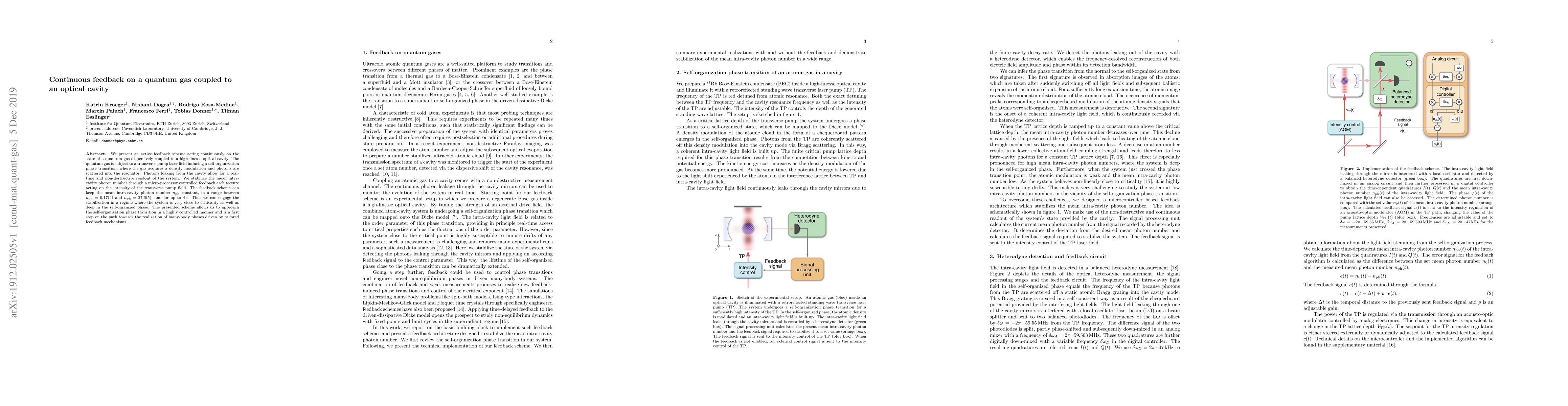 We present an active feedback scheme acting continuously on the state of a quantum gas dispersively coupled to a high-finesse optical cavity. The quantum gas is subject to a transverse pump laser field inducing a self-organization phase transition, where the gas acquires a density modulation and photons are scattered into the resonator. Photons leaking from the cavity allow for a real-time and non-destructive readout of the system. We stabilize the mean intra-cavity photon number through a micro-processor controlled feedback architecture acting on the intensity of the transverse pump field. The feedback scheme can keep the mean intra-cavity photon number $n_\text{ph}$ constant, in a range between $n_\text{ph}=0.17\pm 0.04$ and $n_\text{ph}=27.6\pm 0.5$, and for up to 4 s. Thus we can engage the stabilization in a regime where the system is very close to criticality as well as deep in the self-organized phase. The presented scheme allows us to approach the self-organization phase transition in a highly controlled manner and is a first step on the path towards the realization of many-body phases driven by tailored feedback mechanisms.