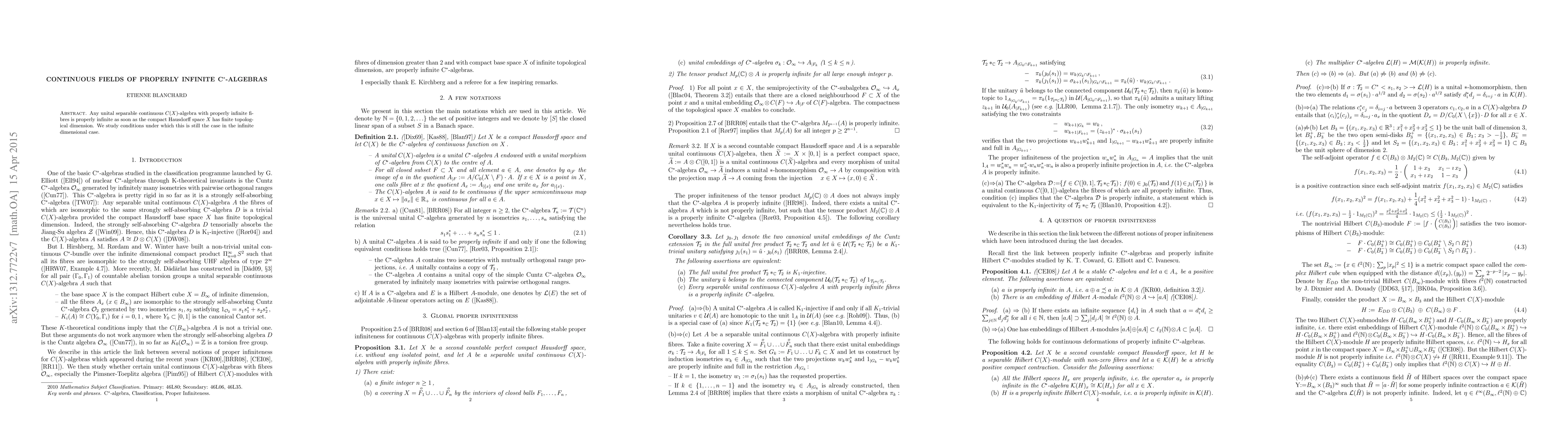 Any unital separable continuous C(X)-algebra with properly infinite fibres is properly infinite as soon as the compact Hausdorff space X has finite topological dimension. We study conditions under which this is still the case in the infinite dimensional case.