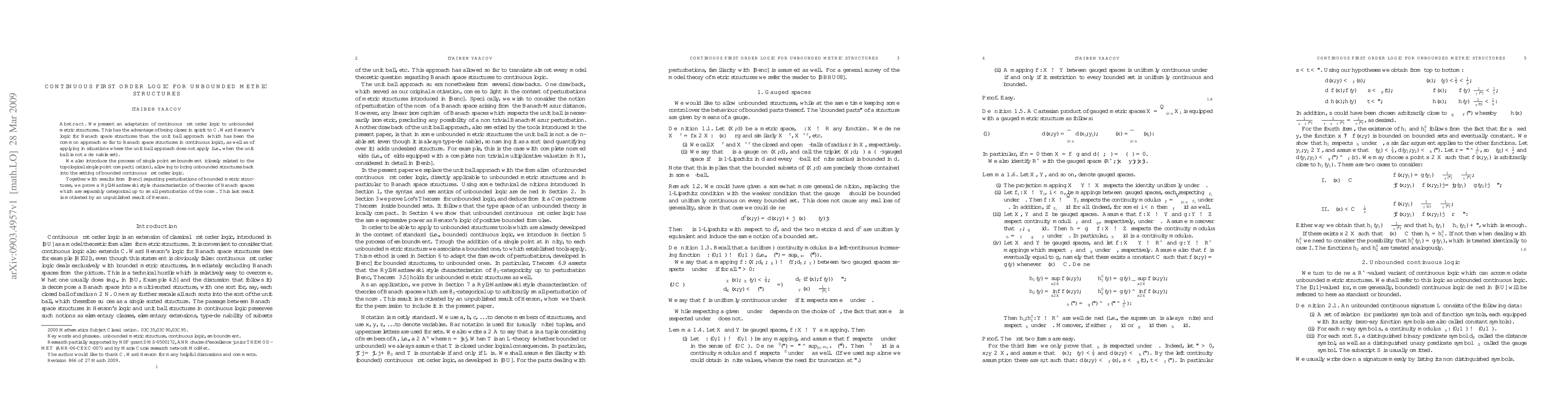 This paper adapts continuous first order logic to unbounded metric structures, offering an alternative to the unit ball approach and introducing single point emboundment. It also proves a Ryll-Nardzewski style characterization for separably categorical Banach spaces under small norm perturbations.
