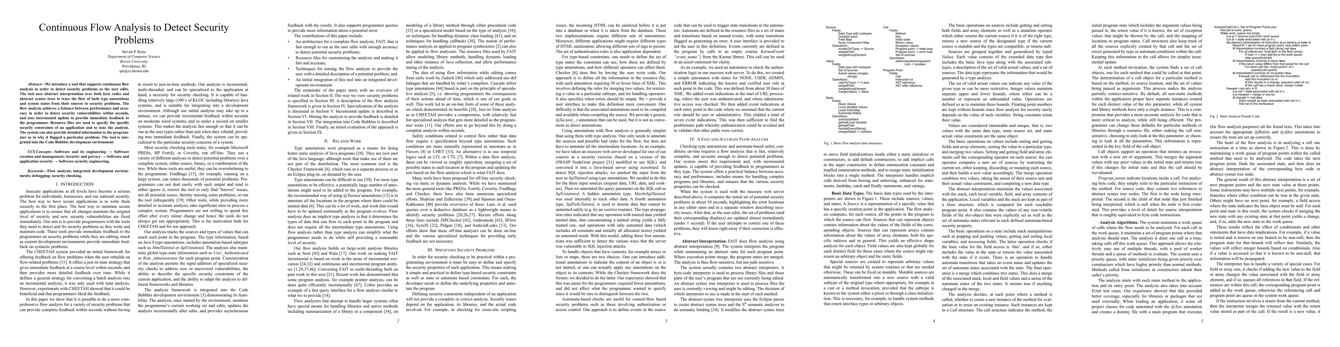 We introduce a tool that supports continuous flow analysis in order to detect security problems as the user edits. The tool uses abstract interpretation over both byte codes and abstract syntax trees to trace the flow of both type annotations and system states from their sources to security problems. The flow analysis achieves a balance between performance and accuracy in order to detect security vulnerabilities within seconds, and uses incremental update to provide immediate feedback to the programmer. Resource files are used to specify the specific security constraints of an application and to tune the analysis. The system can also provide detailed information to the programmer as to why it flagged a particular problem. The tool is integrated into the Code Bubbles development environment.