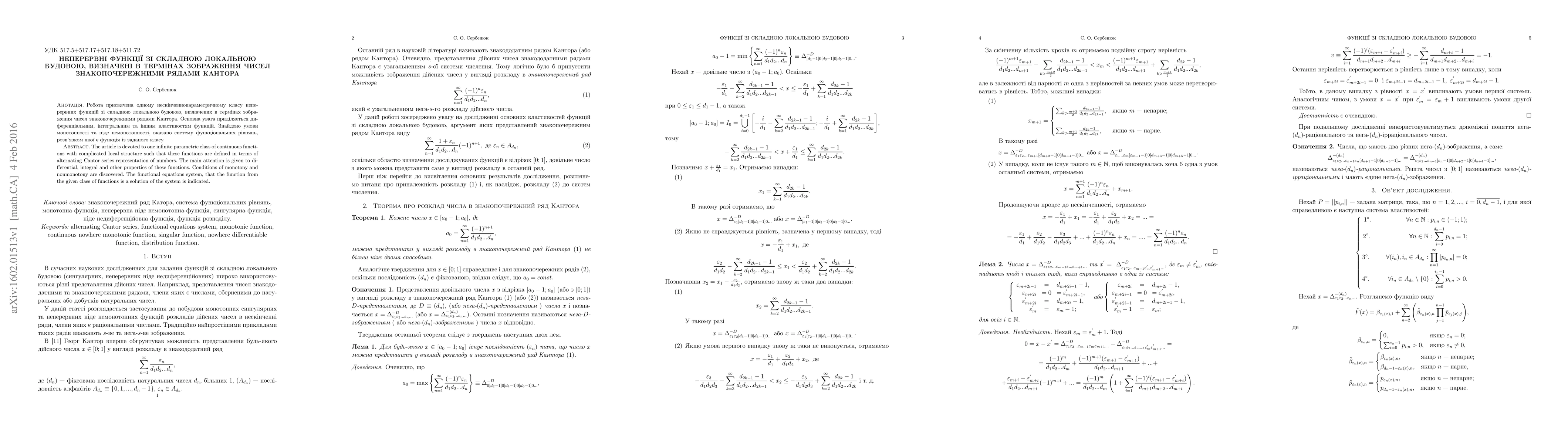 The article is devoted to one infinite parametric class of continuous functions with complicated local structure. In the article differential, integral, self-affine and other properties of functions, that their argument is represented by the alternating Cantor series are investigated. The functional equations systems, that investigating functions are unique solution of these systems in the class of determined and bounded on $[0;1]$ functions are indicated. The investigation was represented in seminar on fractal analysis of Institute of Mathematics of the National Academy of Sciences of Ukraine on, October 16, 2014 (http://www.imath.kiev.ua/events/index.php?seminarId=21&archiv=1). The following investigations in the list of references in the article one can to find by the corresponding links: [6] (http://fmi.npu.edu.ua/images/files/publications/naukchasopys1/NZ2013_15.pdf ) [7] (http://fmi.npu.edu.ua/images/files/publications/naukchasopys1/NZ2013_14.pdf) [8] (http://fmi.npu.edu.ua/images/files/publications/naukchasopys1/NZ2012_13_2.pdf) [9](http://www.ekmair.ukma.edu.ua/bitstream/handle/123456789/7409/Serbeniuk_Funktsii_oznacheni_systemamy.pdf)