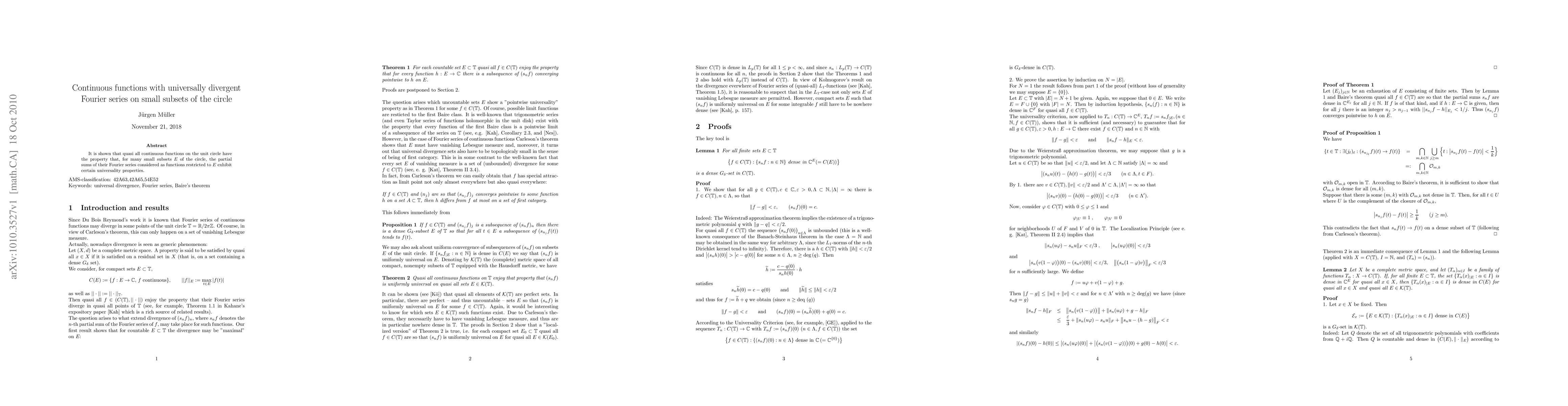 Summary: This paper demonstrates that almost all continuous functions on the unit circle possess the characteristic that their Fourier series' partial sums, when restricted to many small subsets of the circle, exhibit universal divergence properties.