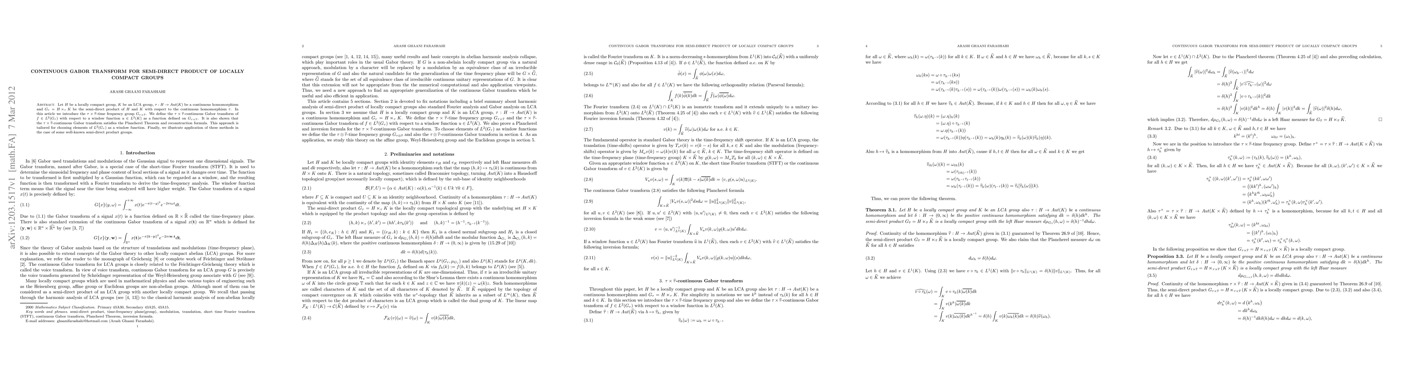 Let $H$ be a locally compact group, $K$ be an LCA group, $\tau:H\to Aut(K)$ be a continuous homomorphism and $G_\tau=H\ltimes_\tau K$ be the semi-direct product of $H$ and $K$ with respect to the continuous homomorphism $\tau$. In this article we introduce the $\tau\times\hat{\tau}$-time frequency group $G_{\tau\times\hat{\tau}}$. We define the $\tau\times\hat{\tau}$-continuous Gabor transform of $f\in L^2(G_\tau)$ with respect to a window function $u\in L^2(K)$ as a function defined on $G_{\tau\times\hat{\tau}}$. It is also shown that the $\tau\times\hat{\tau}$-continuous Gabor transform satisfies the Plancherel Theorem and reconstruction formula. This approach is tailored for choosing elements of $L^2(G_\tau)$ as a window function. Finally, we illustrate application of these methods in the case of some well-known semi-direct product groups.