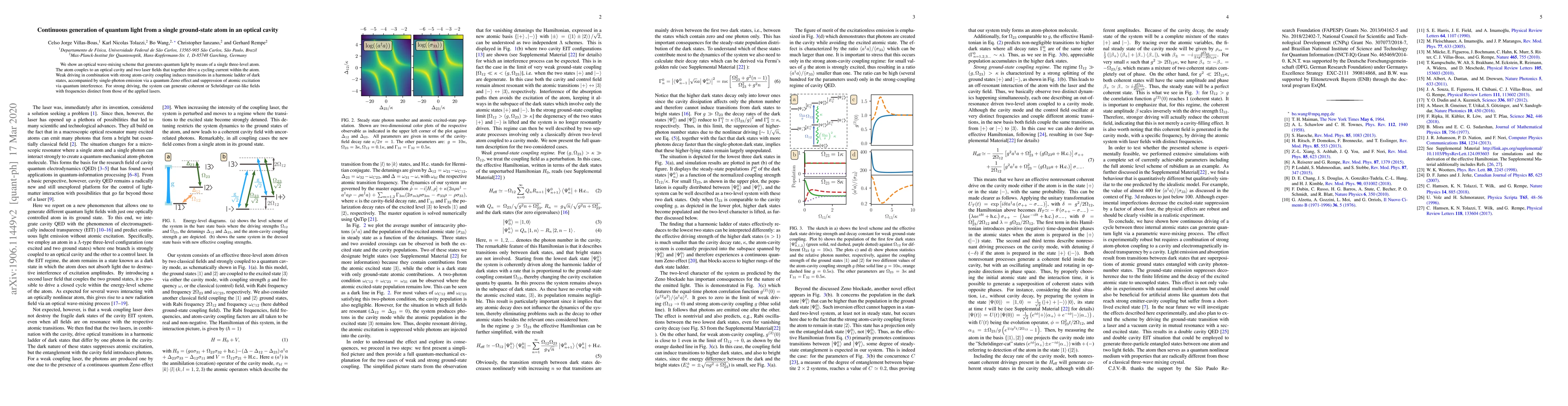 We show an optical wave-mixing scheme that generates quantum light by means of a single three-level atom. The atom couples to an optical cavity and two laser fields that together drive a cycling current within the atom. Weak driving in combination with strong atom-cavity coupling induces transitions between the dark states of the system, accompanied by single-photon emission and suppression of atomic excitation by quantum interference. For strong driving, the system can generate coherent or Schr\"odinger cat-like fields with frequencies distinct from those of the applied lasers.