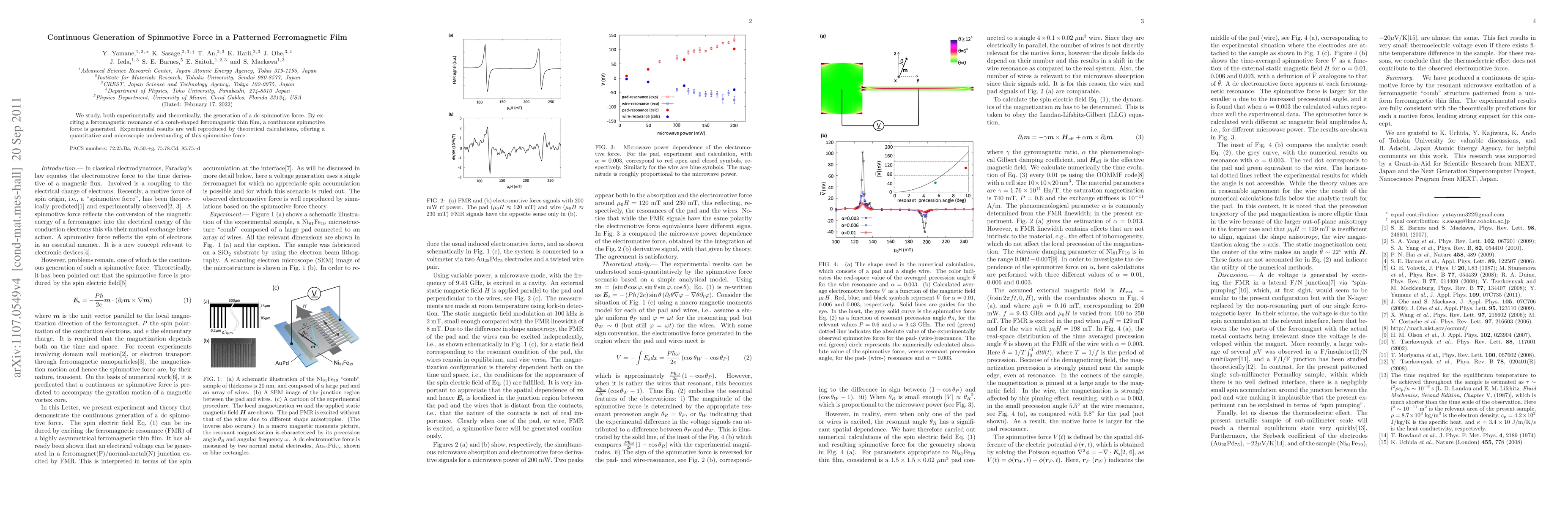 This paper investigates both experimentally and theoretically the continuous generation of a dc spinmotive force in a patterned ferromagnetic film through ferromagnetic resonance excitation. Theoretical calculations accurately reproduce experimental results, providing a detailed microscopic understanding of the phenomenon.