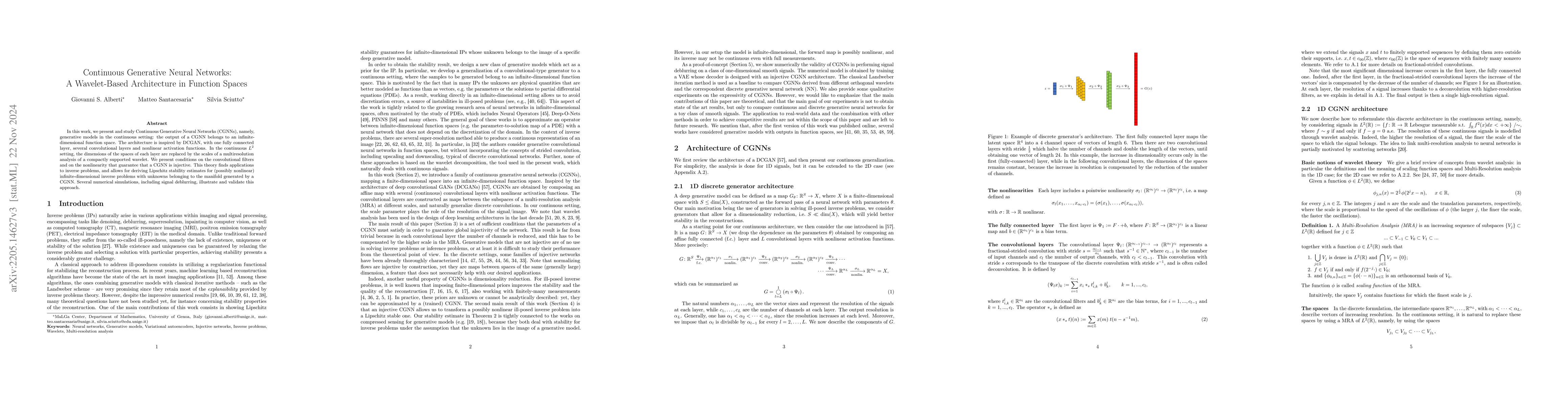 This paper introduces Continuous Generative Neural Networks (CGNNs), which generate infinite-dimensional functions and are inspired by DCGAN. The authors provide theoretical conditions ensuring injectivity and apply these to solve inverse problems, validated through numerical simulations like signal deblurring.