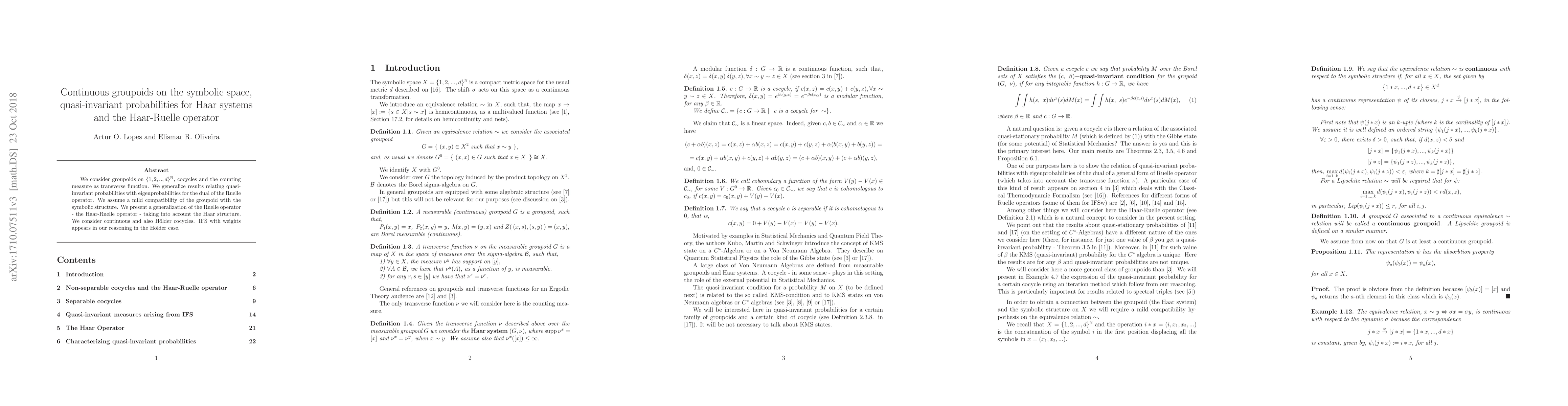 This paper explores groupoids on symbolic spaces, introducing the Haar-Ruelle operator to generalize the Ruelle operator. It studies quasi-invariant probabilities and their relation to eigenprobabilities, considering continuous and H\"older cocycles, and incorporating Iterated Function Systems (IFS) with weights in the H\"older case.