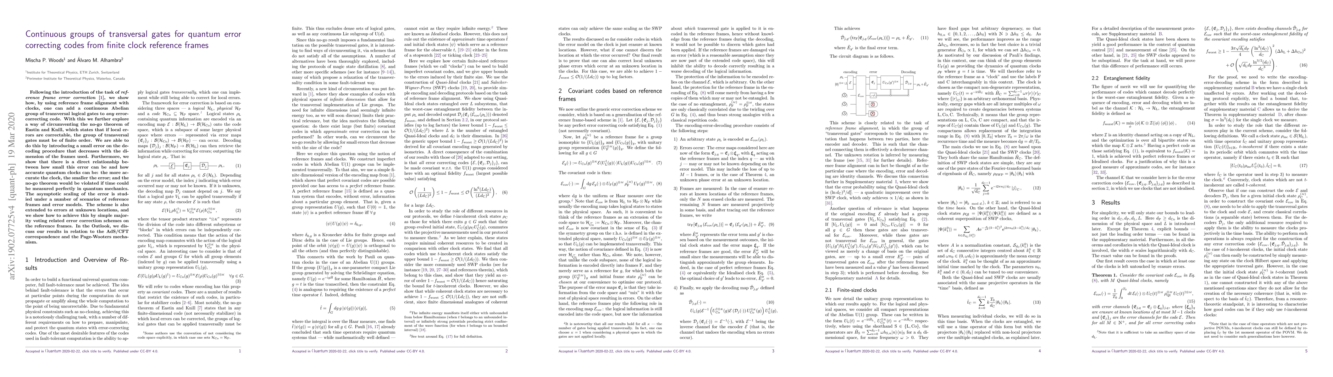 Following the introduction of the task of reference frame error correction, we show how, by using reference frame alignment with clocks, one can add a continuous Abelian group of transversal logical gates to any error-correcting code. With this we further explore a way of circumventing the no-go theorem of Eastin and Knill, which states that if local errors are correctable, the group of transversal gates must be of finite order. We are able to do this by introducing a small error on the decoding procedure that decreases with the dimension of the frames used. Furthermore, we show that there is a direct relationship between how small this error can be and how accurate quantum clocks can be: the more accurate the clock, the smaller the error; and the no-go theorem would be violated if time could be measured perfectly in quantum mechanics. The asymptotic scaling of the error is studied under a number of scenarios of reference frames and error models. The scheme is also extended to errors at unknown locations, and we show how to achieve this by simple majority voting related error correction schemes on the reference frames. In the Outlook, we discuss our results in relation to the AdS/CFT correspondence and the Page-Wooters mechanism.
