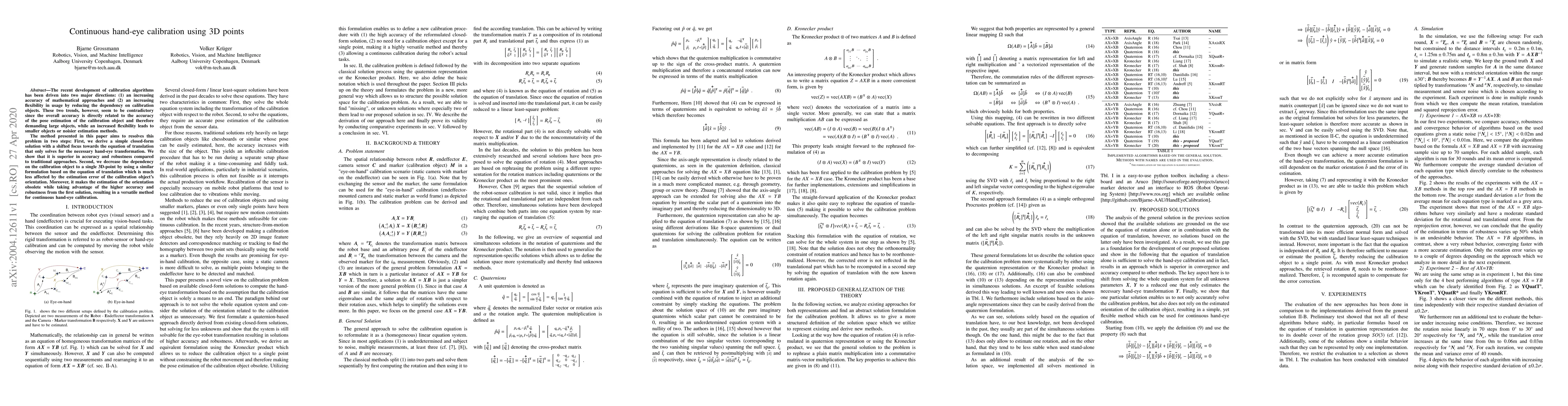 This paper proposes a new method for continuous hand-eye calibration using 3D points, combining high accuracy and robustness with reduced dependency on calibration objects.