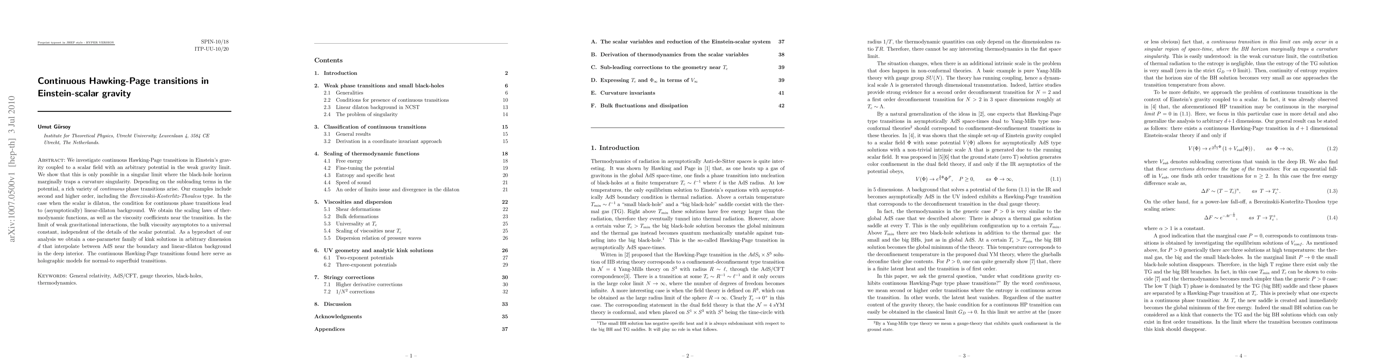 This paper explores continuous Hawking-Page transitions in Einstein-scalar gravity, revealing that such transitions occur in a singular limit where black holes marginally trap a curvature singularity. The study uncovers a variety of continuous phase transitions, including Berezinskii-Kosterlitz-Thouless type, and finds a universal constant for bulk viscosity in weak gravity.