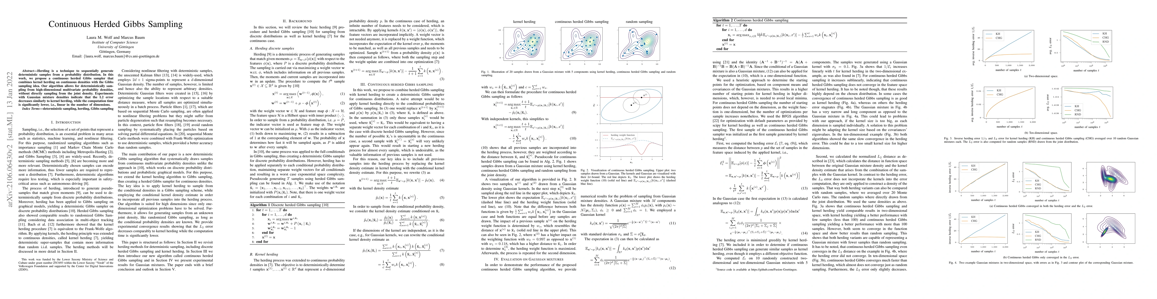 This paper proposes a continuous herded Gibbs sampler that merges kernel herding with Gibbs sampling to generate deterministic samples from high-dimensional multivariate probability distributions, achieving lower computation times compared to kernel herding. Experiments show comparable L2 error reduction with significantly faster processing.