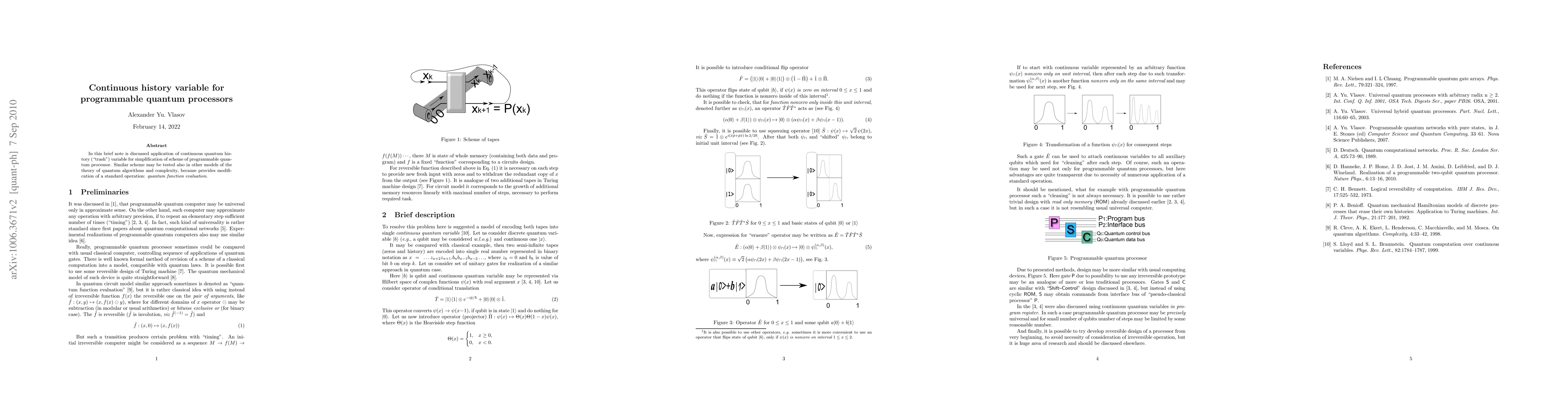 Summary: This paper proposes using a continuous quantum history variable to simplify the design of programmable quantum processors. The suggested scheme can also be tested in various quantum algorithms and complexity models by modifying the standard quantum function evaluation process.