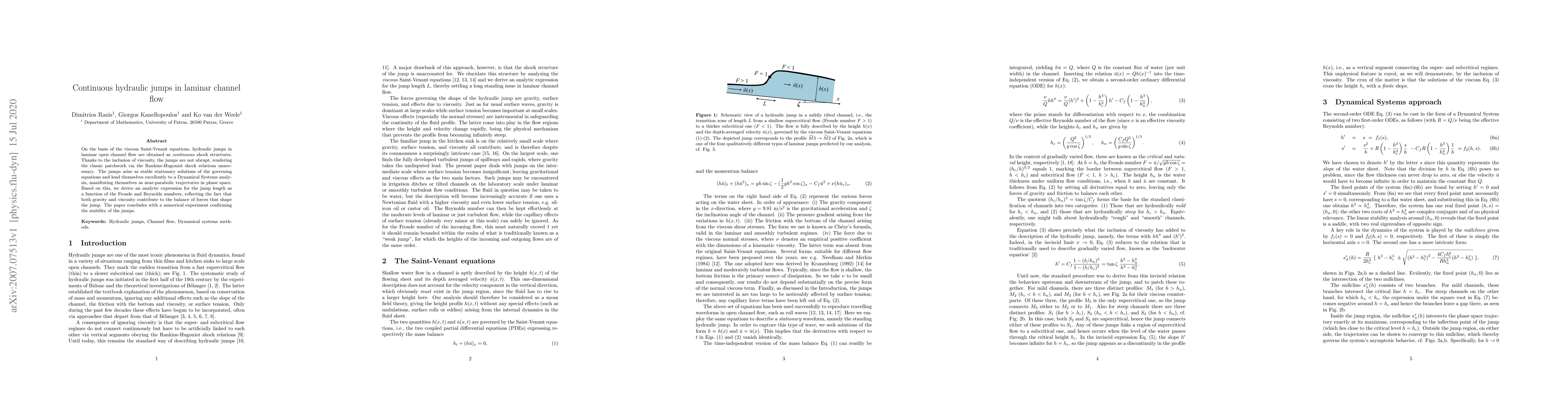 This paper explores continuous hydraulic jumps in laminar channel flow using viscous Saint-Venant equations, revealing them as stable, non-abrupt shock structures. An analytic expression for jump length is derived based on the interplay of gravity and viscosity, validated by a numerical experiment confirming their stability.