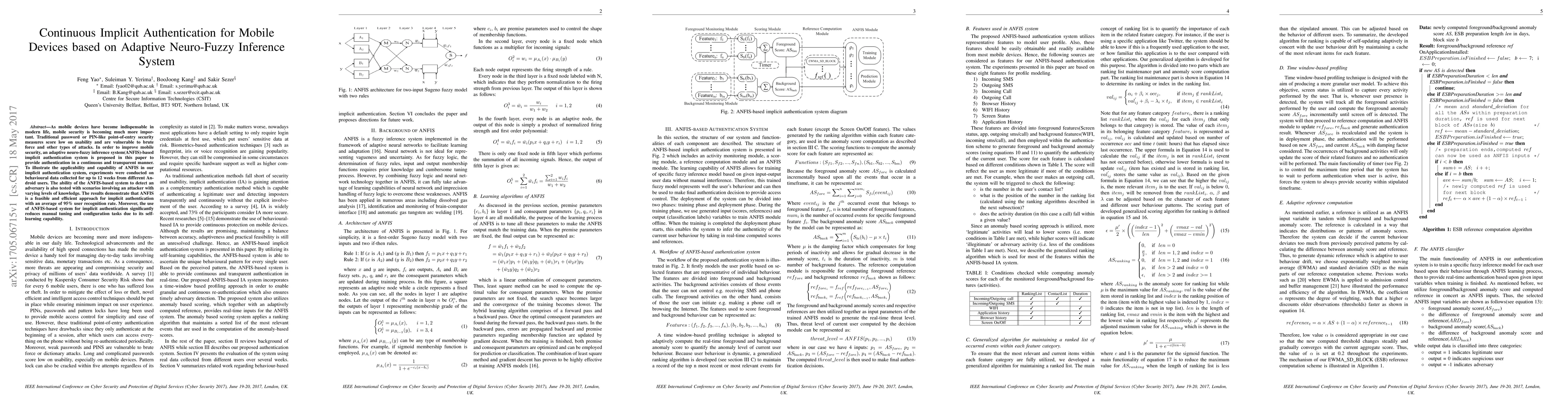 This paper proposes an adaptive neuro-fuzzy inference system (ANFIS) for continuous implicit authentication on mobile devices, achieving a 95% user recognition rate. The ANFIS-based system enhances security while reducing manual configuration, improving both usability and robustness against attacks.